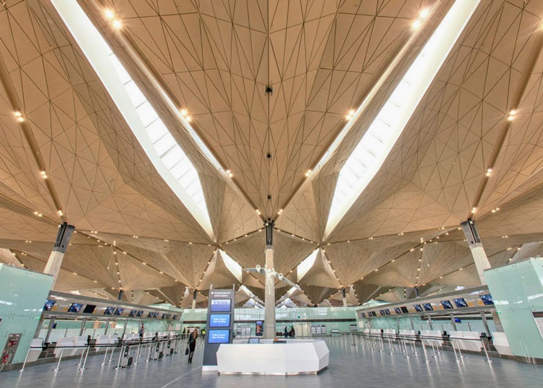 The terminal facilitates up to 45 million passengers per year and features thousands of hexagonal skylights to allow natural light into the structure.