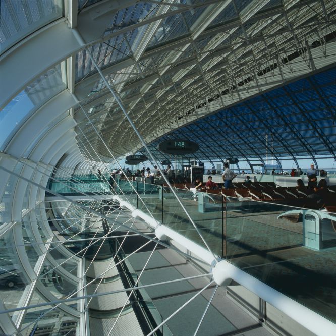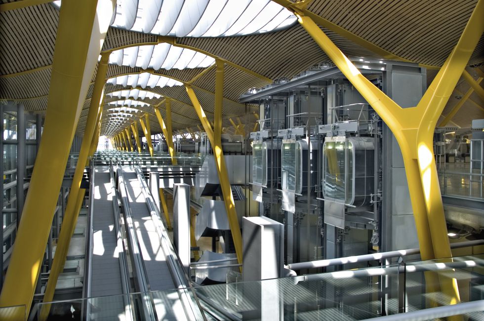 Las olas de acero que cubren la Terminal 4 del aeropuerto de Barajas, considerado uno de los más bellos del mundo, son ya un icono de Madrid para los viajeros. El edificio, proyectado por Richard Rogers con la colaboración del Estudio Lamela, se inauguró el 4 de febrero de 2006. Los colores del arco iris pintados en la estructura principal son una refrescante irradiación pop en tierras de secano. Una obra de enormes dimensiones cuyo envoltorio desenfadado esconde un corazón high-tech.