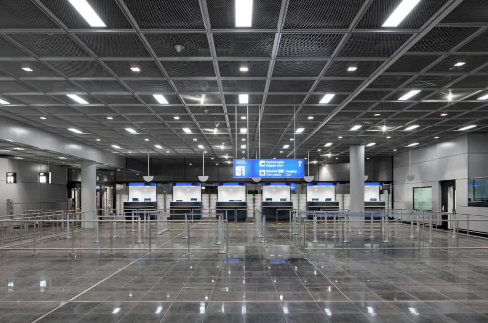 Líneas depuradas y un espacio de una nitidez extraordinaria en el control de pasaportes de la ampliación de la terminal A del aeropuerto de Frankfurt.