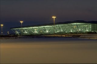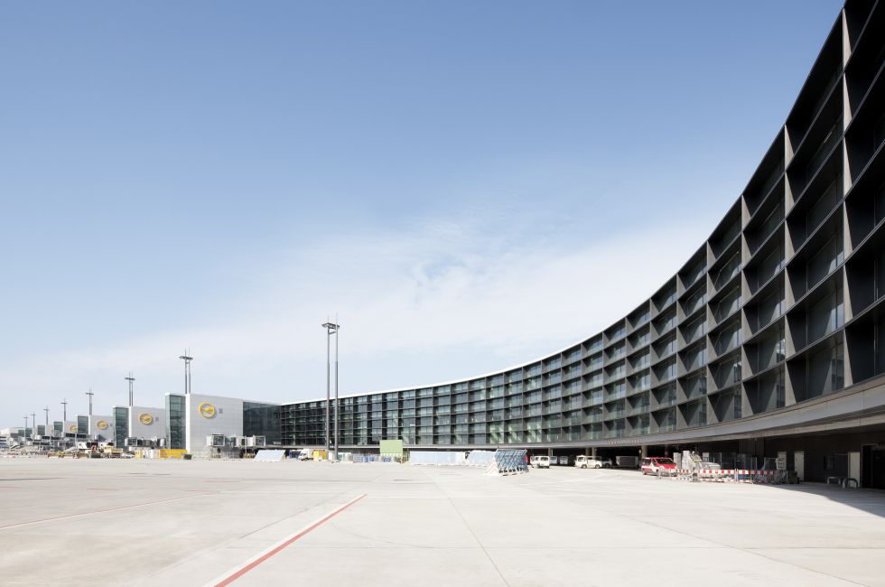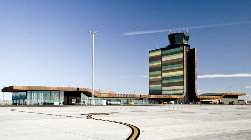 Aeropuerto de Lleida, un derroche de colores verdosos y pardos en un edificio-manto que se confunde con los campos de labor circundantes. Obra de b720 Fermín Vázquez Arquitectos.