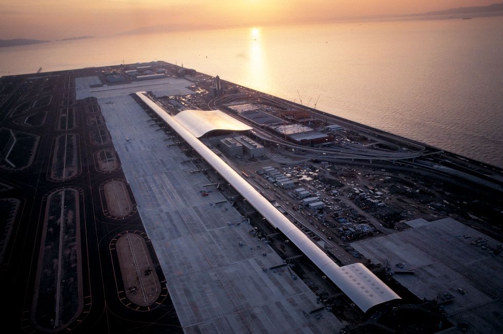 Aeropuerto Internacional de Kansai, de Renzo Piano, construido en una isla artificial en la bahía de Osaka, Japón. Mide cuatro kilómetros de largo por uno de ancho y abrió sus puertas en 1994.