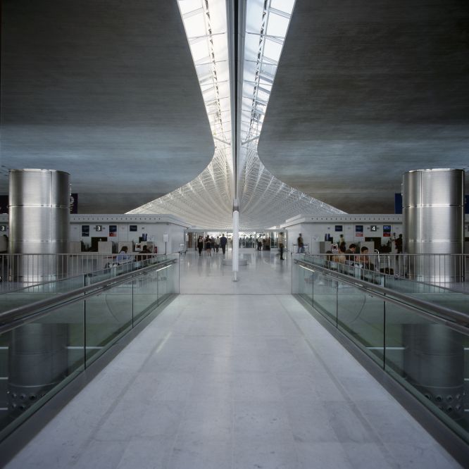 Interior de la terminal 2F del aeropuerto parisiense Roissy Charles de Gaulle, proyectada por el arquitecto francés Paul Andreu, autor de varios aeropuertos en el mundo y de edificios emblemáticos como el Arco de la Defense, también en la capital francesa.