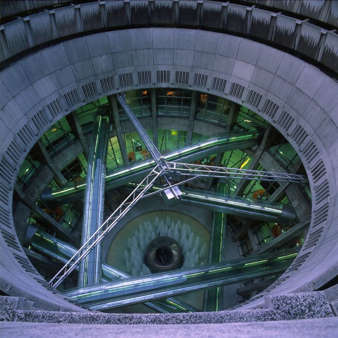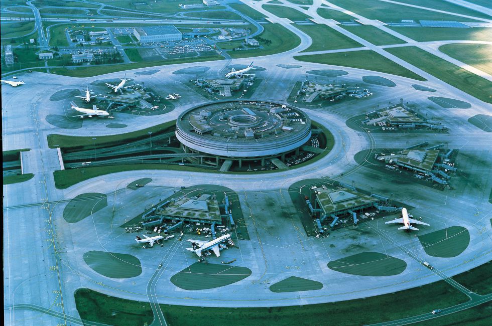 La terminal 1 del aeropuerto Charles De Gaulle, en las cercanías de París, abrió en 1974. Su diseño vanguardista parte de un edificio circular de diez pisos rodeado por siete edificios satélites, cada uno con seis puertas. El arquitecto principal fue Paul Andreu, uno de los más reconocidos arquitectos franceses, especializado en proyectar aeropuertos.