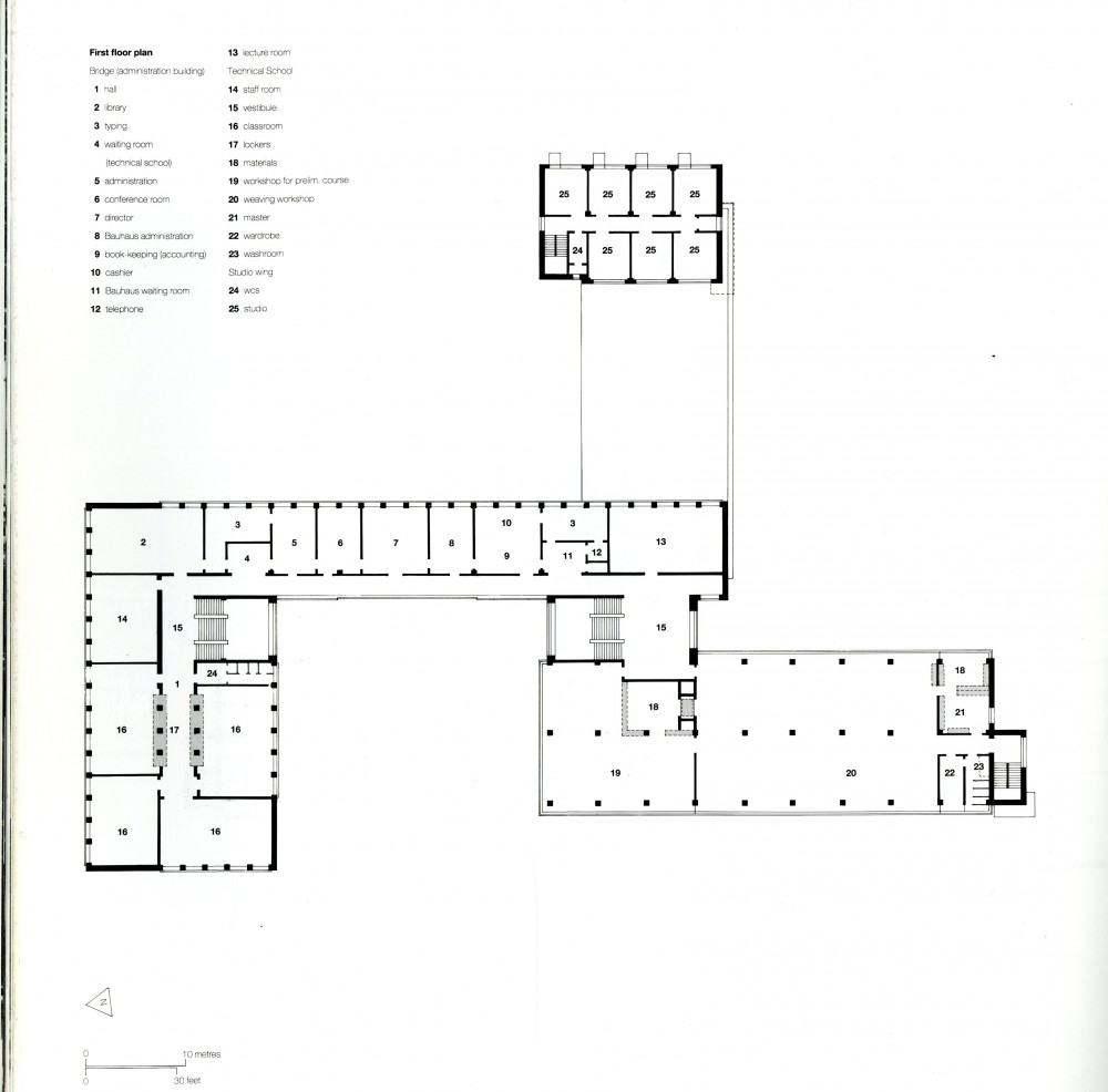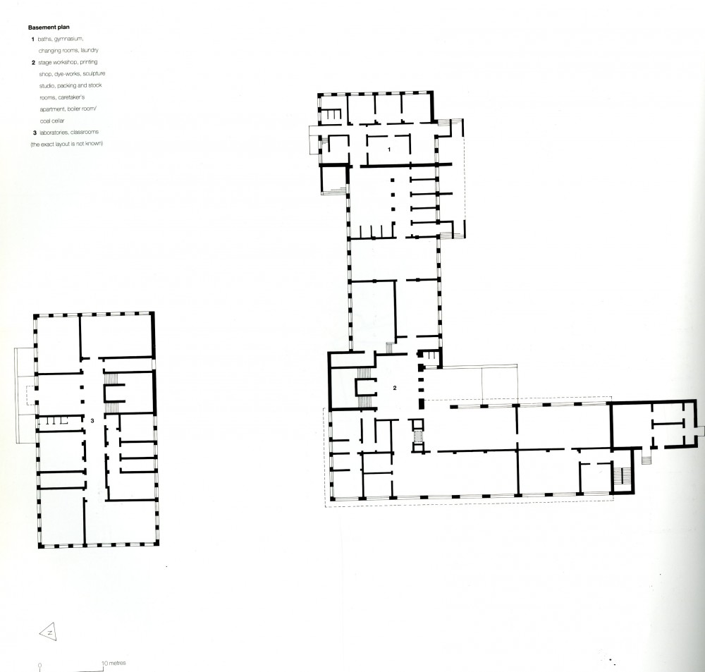 The extensive facilities in the plans of the Bauhaus at Dessau include spaces for teaching, housing for students and faculty members, an auditorium and offices, which were fused together in a pinwheel configuration. From the aerial view, this layout hints at the form of airplane propellers, which were largely manufactured in the surrounding areas of Dessau.