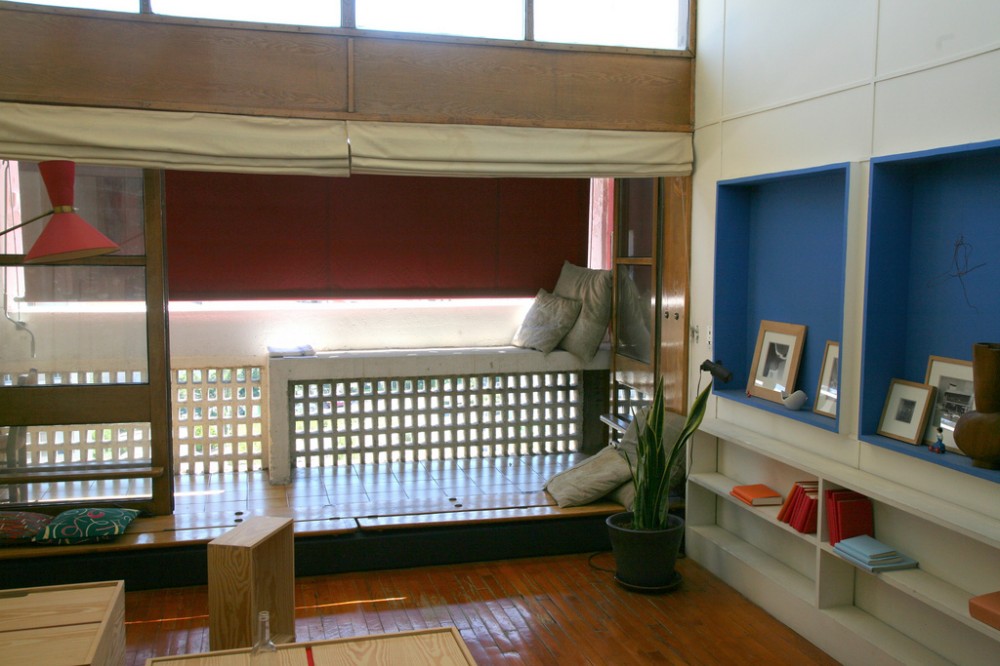 One of the most interesting and important aspects of the Unite d’ Habitation is the spatial organization of the residential units. Unlike most housing projects that have a “double-stacked” corridor (a single hallway with units on either side), Le Corbusier designed the units to span from each side of the building, as well as having a double height living space reducing the number of required corridors to one every three floors. By narrowing the units and allowing for a double height space, Corbusier is capable of efficiently placing more units in the building and creating an interlocking system of residential volumes. At each end of the unit there is a balcony protected by a brise-soleil that allows for cross ventilation throughout the unit flowing through the narrow bedrooms into the double height space; emphasizing an open volume rather than an open plan.