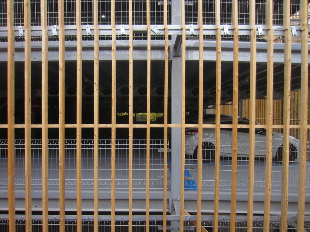 El aparcamiento de 5 niveles diseñados en forma contrapeada, ofrece alrededor de 400 plazas a las que se accede a través de tres núcleos de hormigón externos con escalera. Con el fin de evitar esfuerzos no deseados, por ejemplo los ocasionados por dilataciones, los núcleos de escalera están colocados en el exterior de la estructura principal de acero. Con dimensiones en planta de 32m x 60m y un típico módulo de 15,75m x 5m, el aparcamiento cumple con los conceptos establecidos y se beneficia de la flexibilidad de diseño de la construcción mixta de acero.