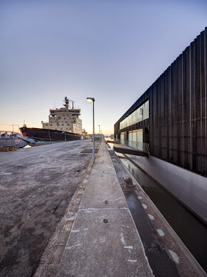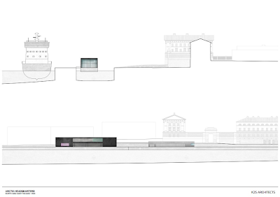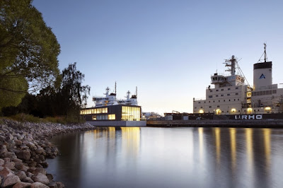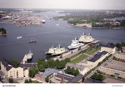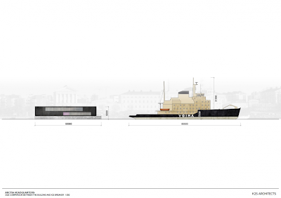 Descripción de los arquitectos. Los rompehielos atracados son una parte esencial del entorno de Katajanokka. El nuevo cuartel de Arctia Shipping se colocará en un edificio de oficinas flotando en frente del edificio principal del Ministerio finlandés de Asuntos Exteriores, que fue diseñado originalmente por C.L. Engel.