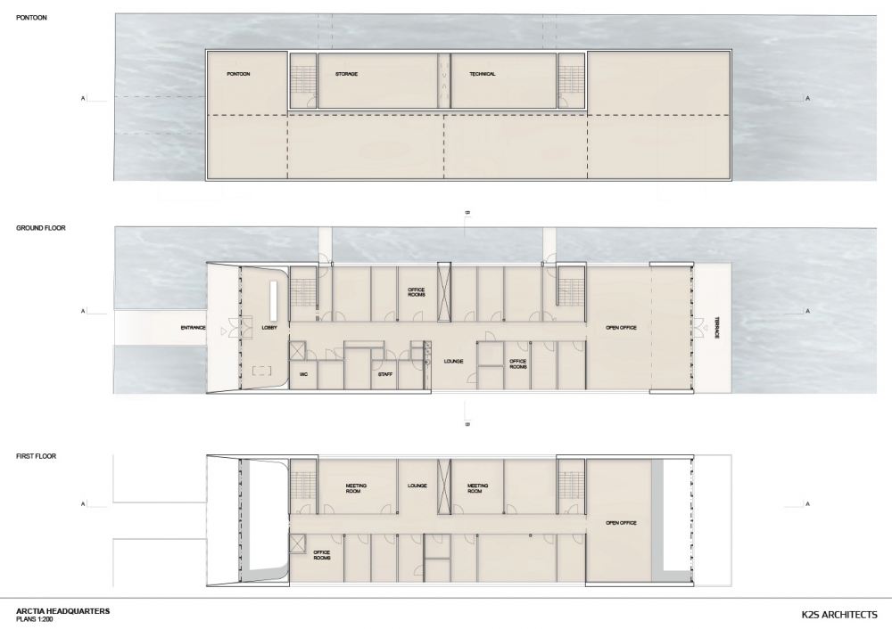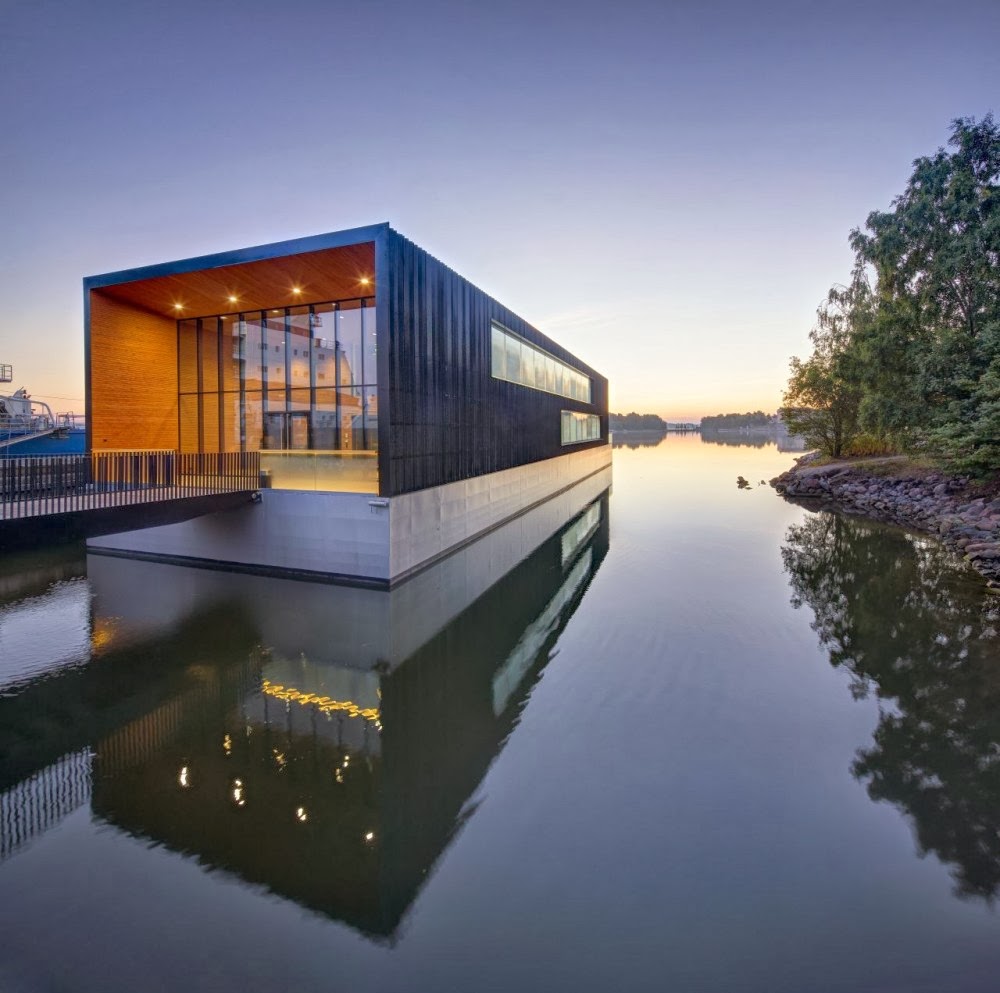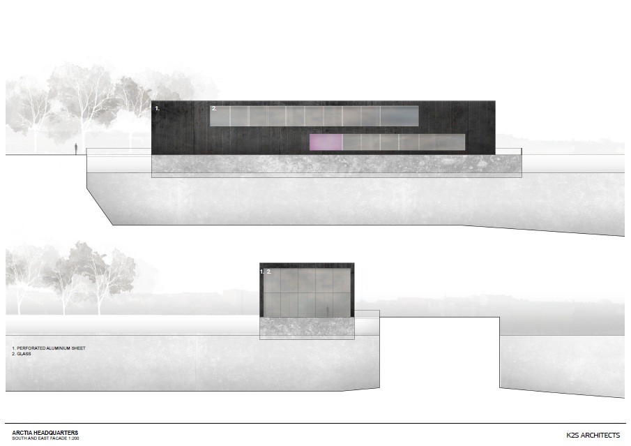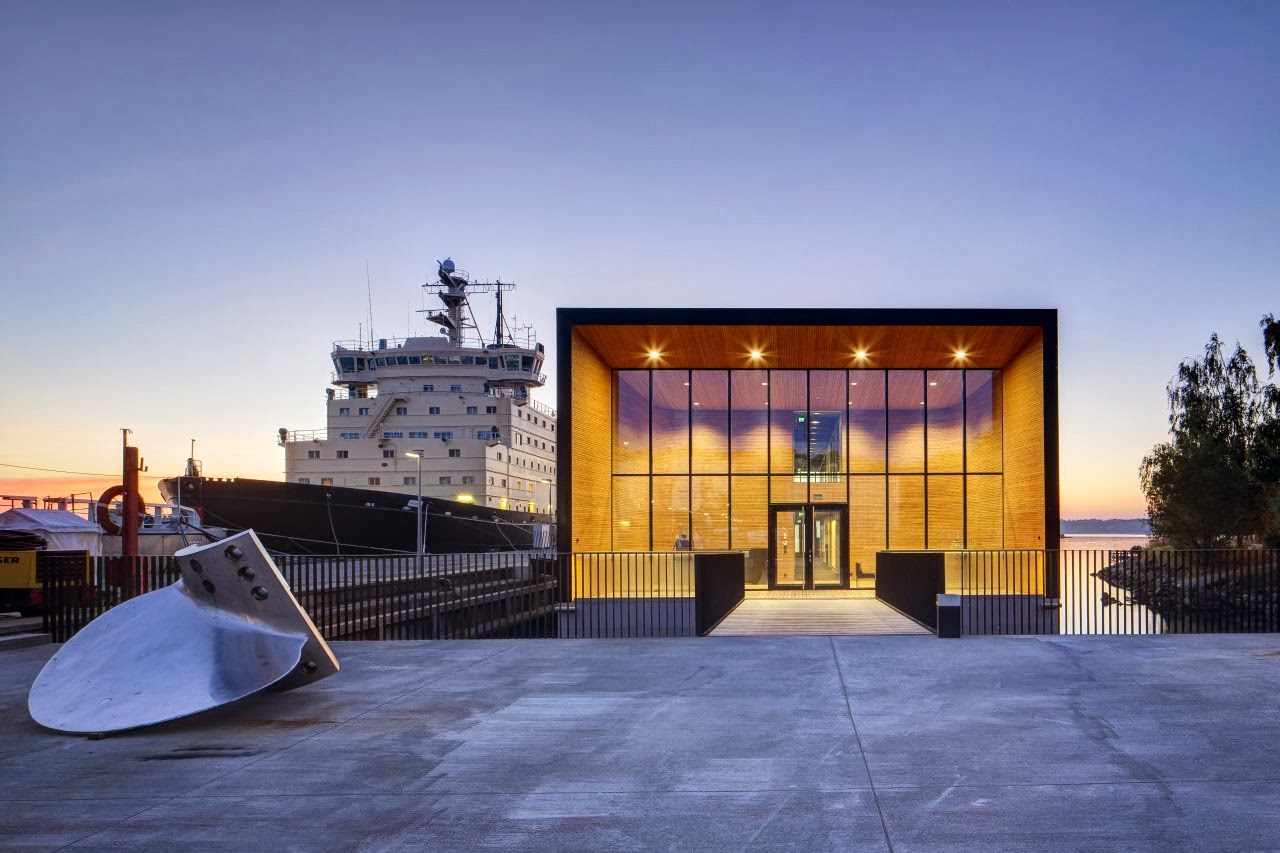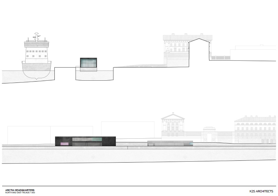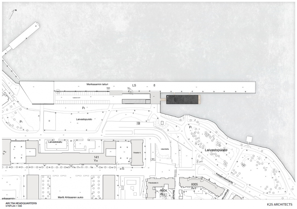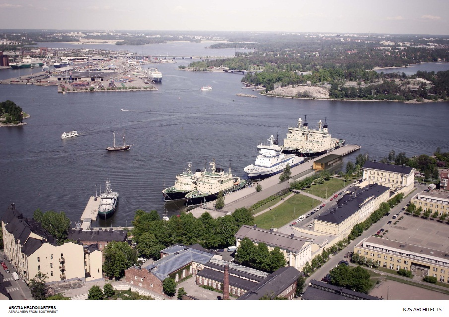 Descripción de los arquitectos. Los rompehielos atracados son una parte esencial del entorno de Katajanokka. El nuevo cuartel de Arctia Shipping se colocará en un edificio de oficinas flotando en frente del edificio principal del Ministerio finlandés de Asuntos Exteriores, que fue diseñado originalmente por C.L. Engel.