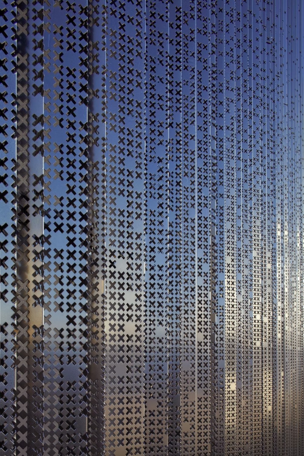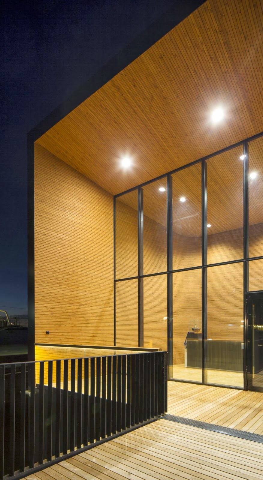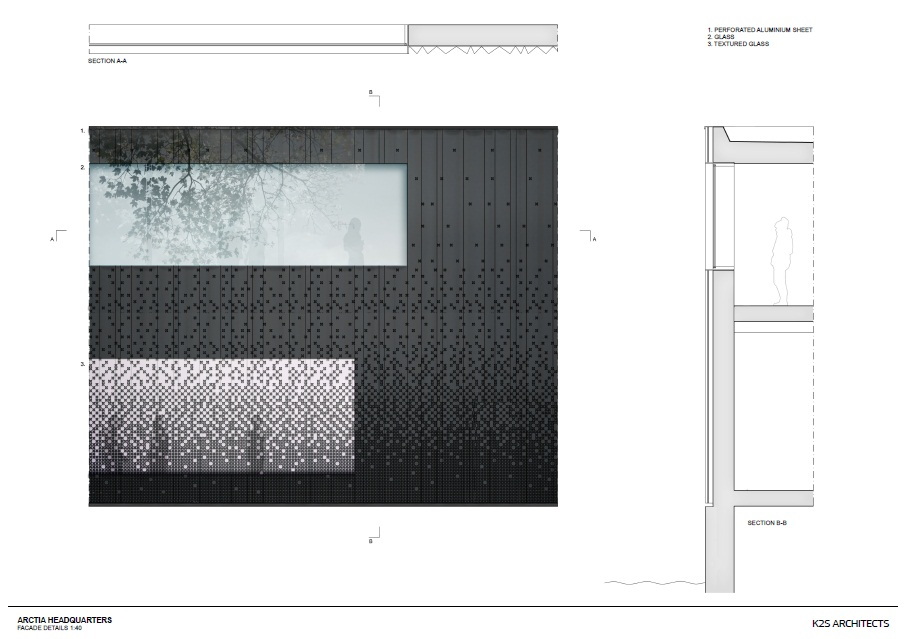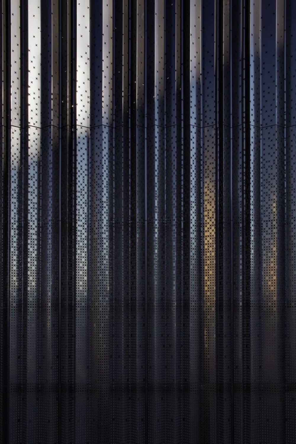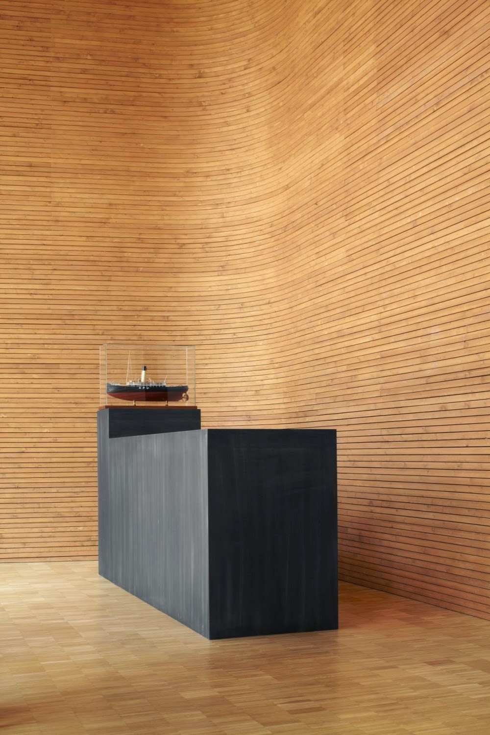 La volumetría horizontal y fachadas de acero negro personalizadas se relacionan con los cascos negros de los barcos. El interior de la “nave de acero negra” está hecho de madera lacada que se relaciona con la tradicional construcción de de los barcos en sus inicios. Las fachadas del edificio son hechos en base a perfiles de acero de onda y patrón personalizado. Existe una gradiente y el patrón abstracto perforado en los perfiles de acero se relaciona con cristales de hielo y los patrones textiles de marinero.