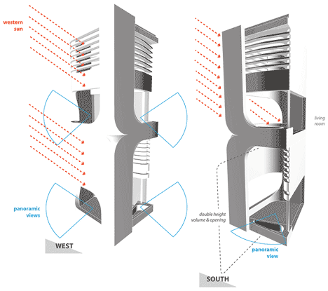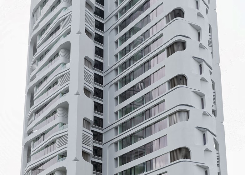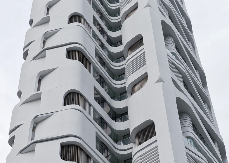 The curved details of the opaque concrete facade are intended to replicate organic forms found in nature, while large bay windows and double-height balconies were added to allow extensive views across the city skyline.
