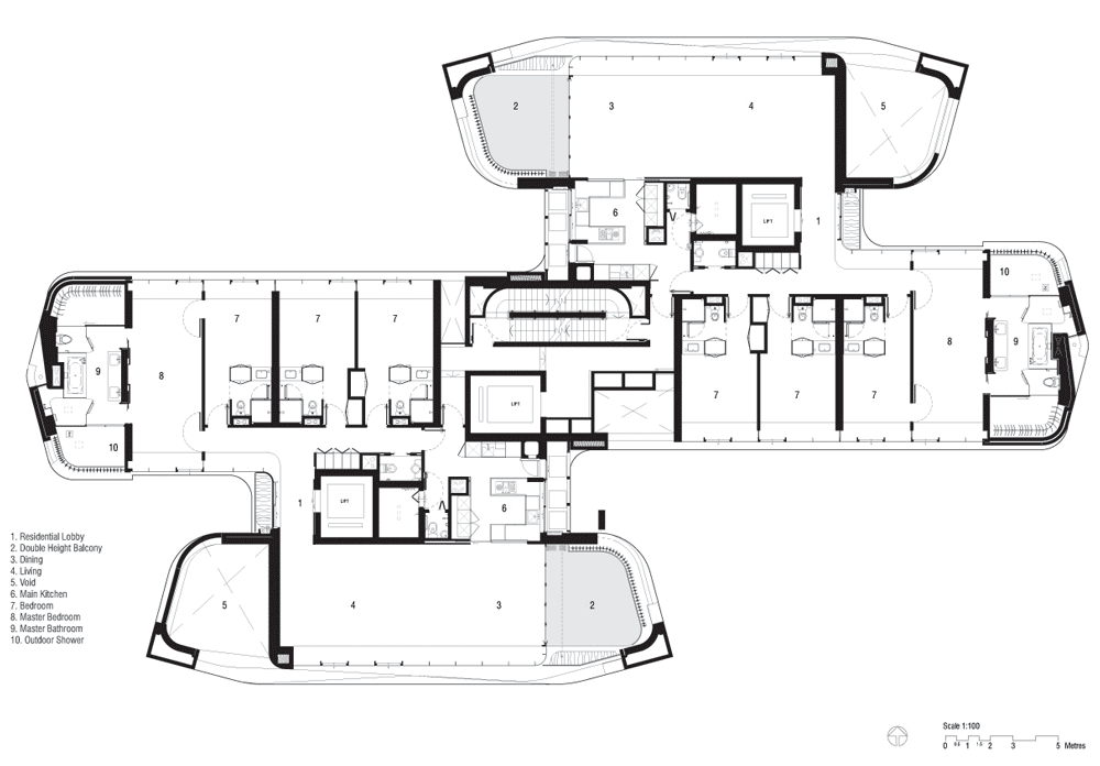 The first residential level of the Ardmore Residence is located on the eighth storey of the building. An open framework is therefore introduced at the base of the raised tower which enables full connectivity and transparency across the ground level landscaping, while simultaneously organising the shared amenity facilities.