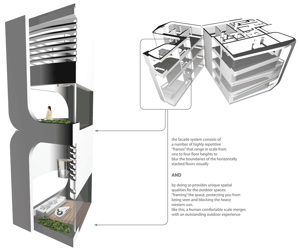 The facade of the Ardmore Residence is derived from micro-design features which interweave structural elements, such as bay windows and balconies into one continuous line. The facade pattern is repeated for every four storeys of the building, whilst rounded glass creates column-free corners, visually merging the internal spaces with the external balconies. Intertwining lines and surfaces wrap the apartments, seamlessly incorporating sun screening, whilst also ensuring that the inner qualities of the apartments and the outer appearance of the building together form a unified whole.