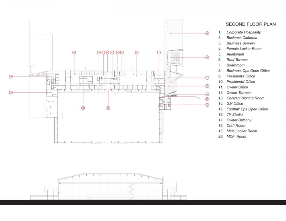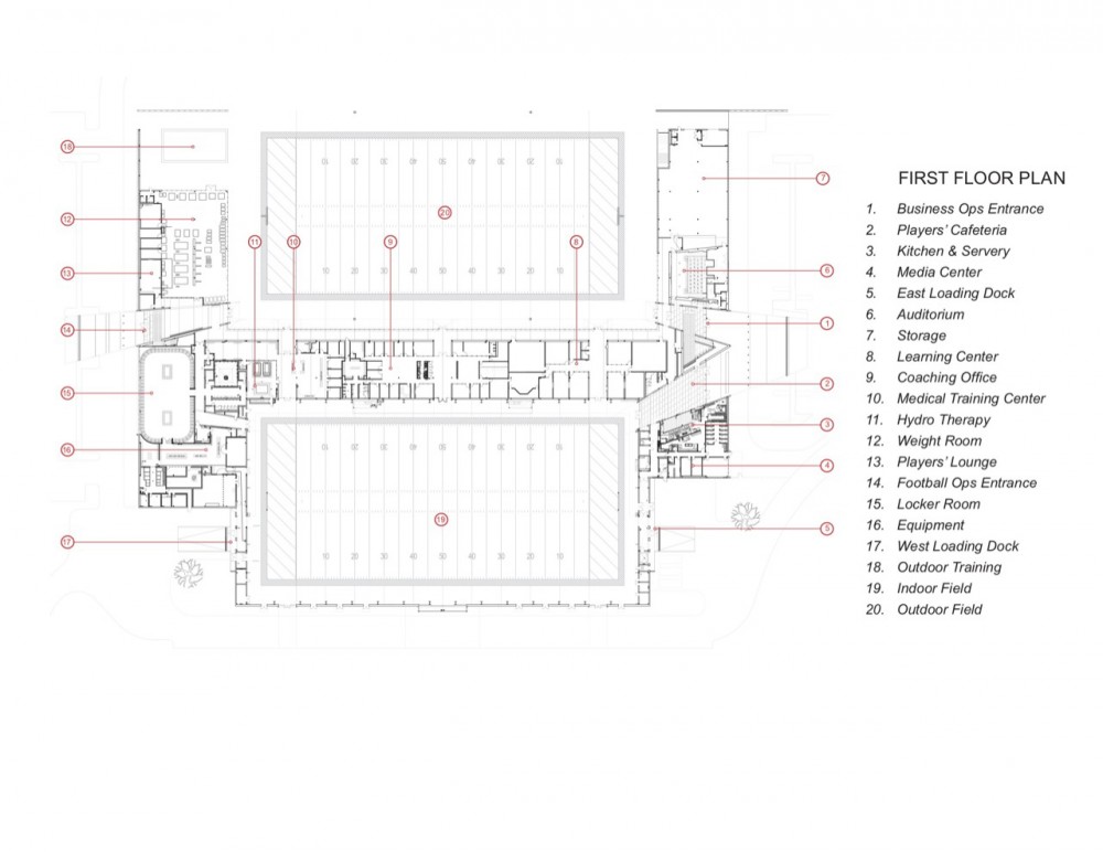 SOM carefully considered the adjacencies and relationships between the various program elements to ensure the maximum efficiencies within the highly complex and varied program of the building, and also to create the necessary separation between the players and football staff and the business operations. The plans of the facility allows the daily operations to occur with a high degree of efficiency, both in terms of player’s daily routines and the necessary back-of- house operations that support the team and allow the team to move with ease from the training center to the home stadium to the airport. The equipment, media and other support areas are situated so that they can support coaches and players seamlessly and transparently.
