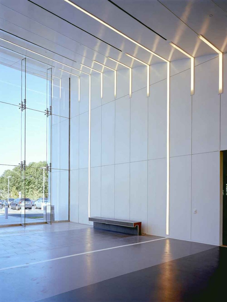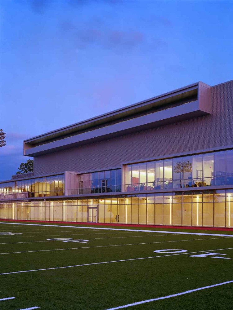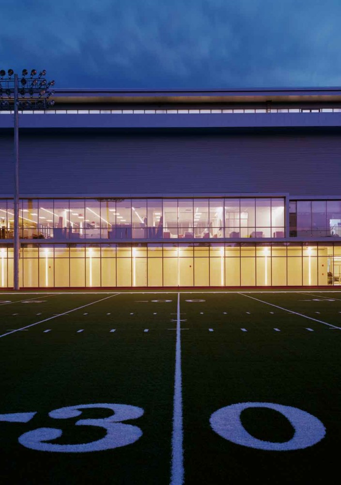 The entire facility is organized around the football fields so views of the fields are always immediate from the moment of entering the 600-foot-long building. The design integrates the yard integers of the field into the building’s lighting and other finishes, another constant reminder that football is the main order of the day.