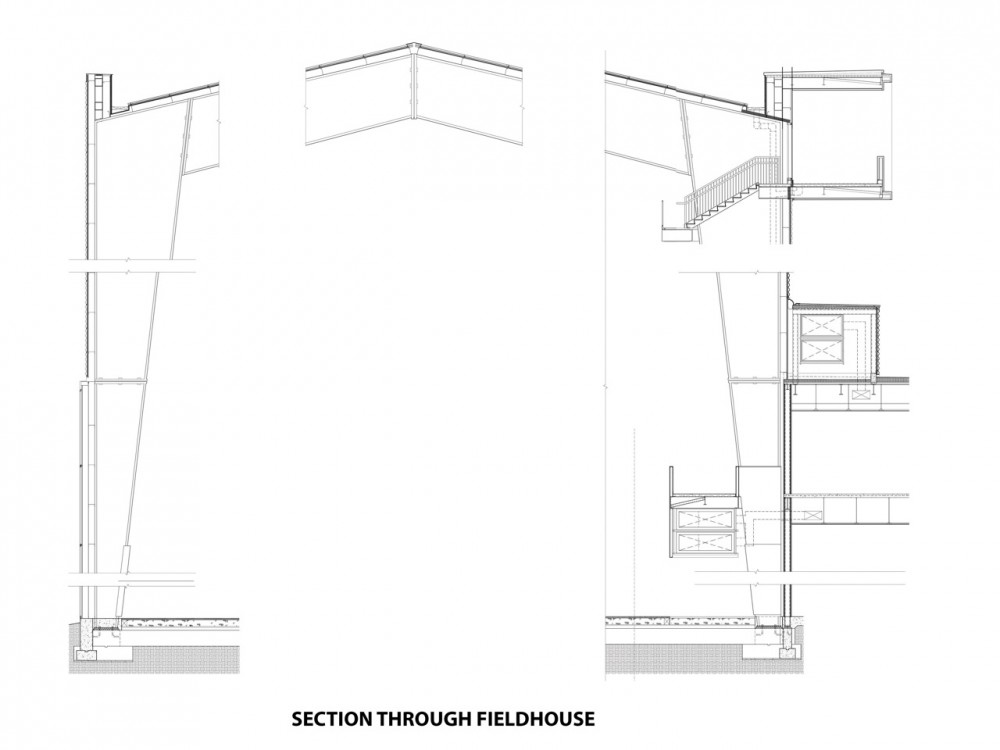 Campus building is a two-story steel structure clad in flat and corrugated metal panels and low-iron glass. Perforated corrugated metal covers the exterior mechanical areas. The campus building’s roof is covered in a light-colored membrane, while the field house has a standing-seam metal roof. Players’ gallery is cantilevered which allows for thin glass curtain wall and no columns. Field house is a long-span rigid frame.