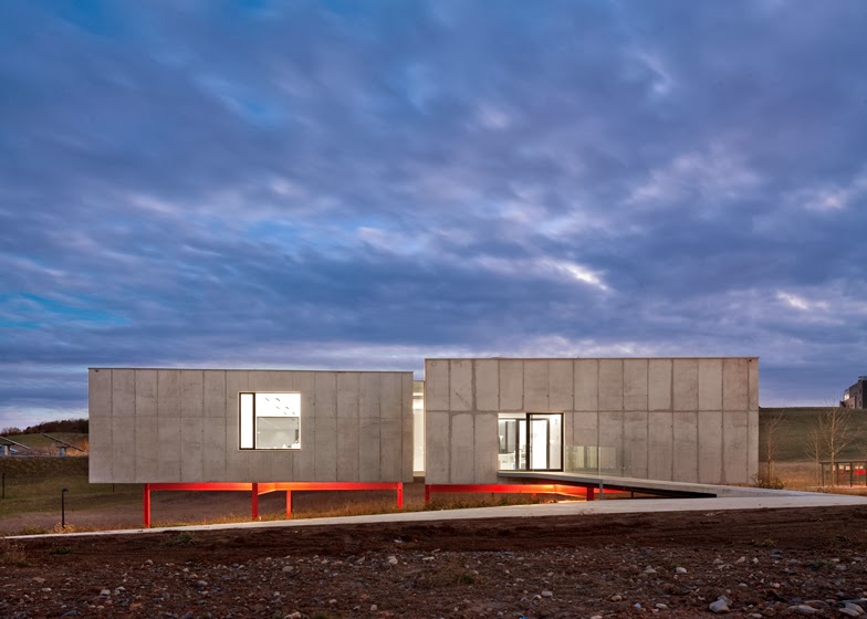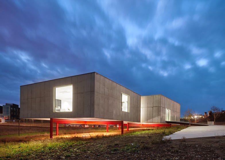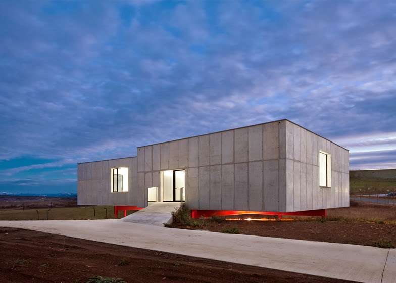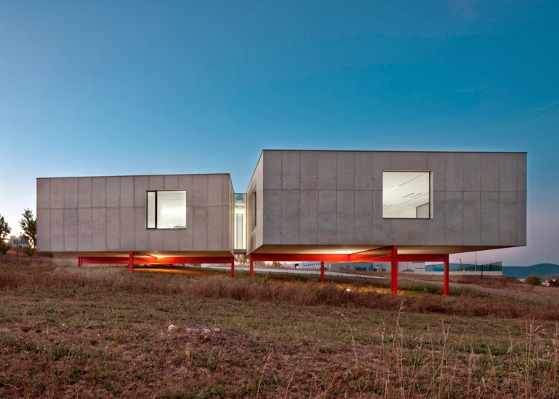 Spanish architects Taller Básico de Arquitectura hoisted this pair of concrete laboratories in northern Spain onto red metal stilts.