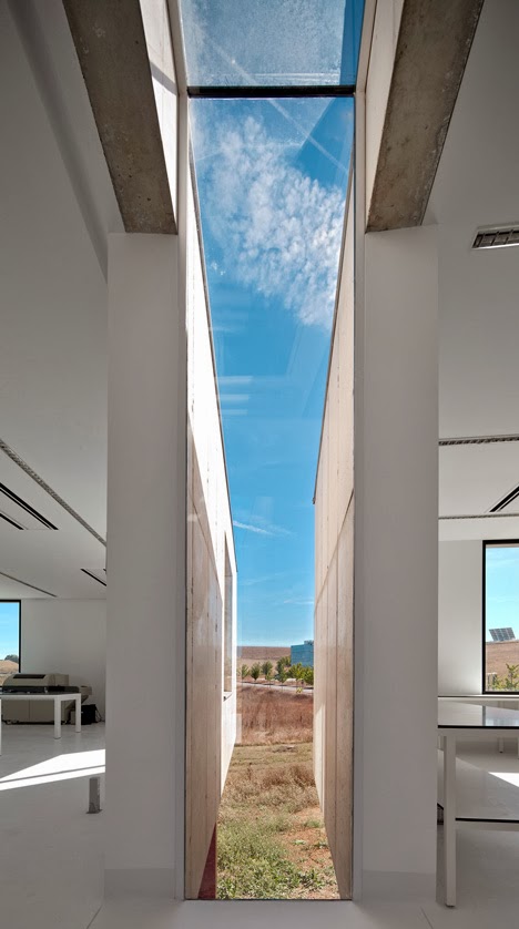 Inside, plasterboards cover the structure. The window frame, drawn as a single line, stays hidden between both sheets. The gap between sheets, both in walls and slabs, contains all building systems, as plumbing, electricity, voice and data. This net of systems solves the flexibility needed by the laboratory for its continuous transformation.