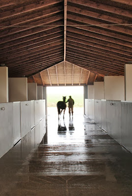 Wooden beams are left exposed on the underside of a gently sloping steel roof, which shelters eight concrete horse pens and a central corridor.