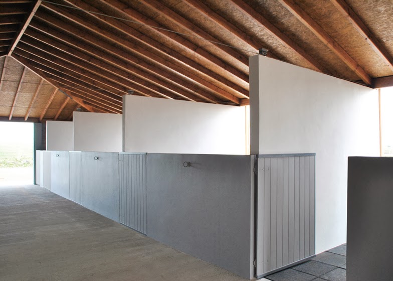 Wooden beams are left exposed on the underside of a gently sloping steel roof, which shelters eight concrete horse pens and a central corridor.