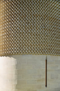 La capilla, vista desde el exterior, es un solo recinto de piedra. Hemos utilizado piedra Clipsham que se relaciona tanto en términos de textura y coloración, a la piedra caliza de la universidad existente. Los muros exteriores son de construcción de cavidad aislada, que consta de una hoja interna de blockwork reforzado curvado y piedra labrada en la hoja exterior. La base de la capilla y las estructuras auxiliares están revestidas en piedra sillar. La sección superior de la capilla principal se reviste de piedra muros recortada. La pared de la capilla está coronada por un halo de aletas de piedra natural. Las aletas se sientan delante de unidades de doble acristalamiento de alto rendimiento, montadas en marcos de metal ocultos.