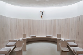 Disfrutamos de la geometría de la elipse. Para construir una elipse el círculo estable se juega contra la línea, que es sobre el movimiento de ida y vuelta. Para nosotros esto refleja la idea de intercambio entre lo perfecto y lo imperfecto en el centro del pensamiento cristiano. El movimiento inherente en la geometría se expresa en la capilla a través del deambulatorio perimetral. Es posible caminar alrededor de la capilla, mirando hacia el espacio más brillante en el centro. El sentido de mirar hacia un claro iluminado se remonta a las primeras iglesias. Hicimos un claro para reunirse en la luz.