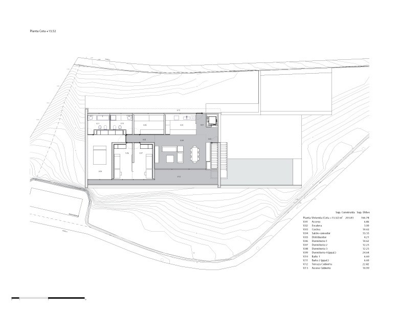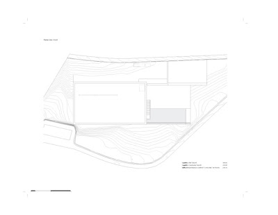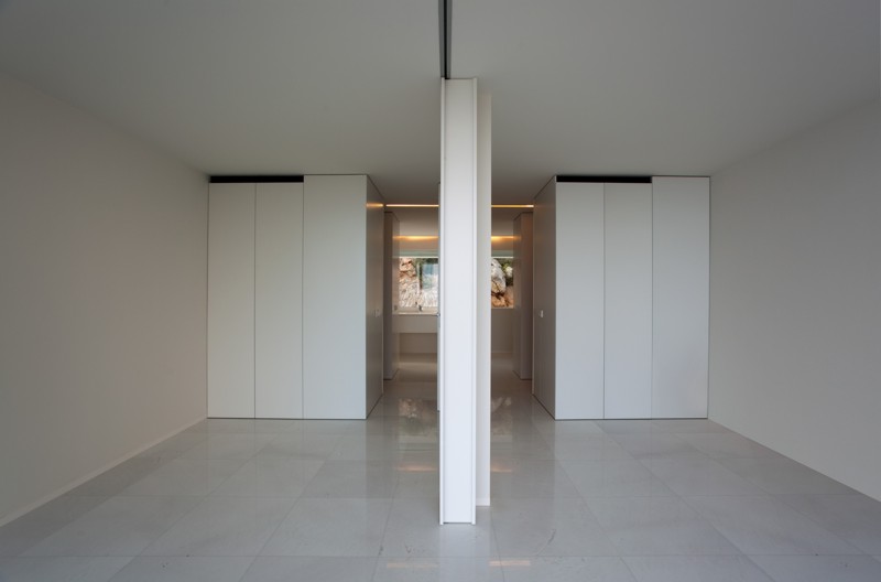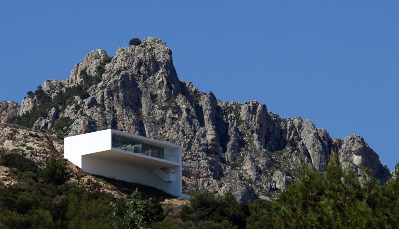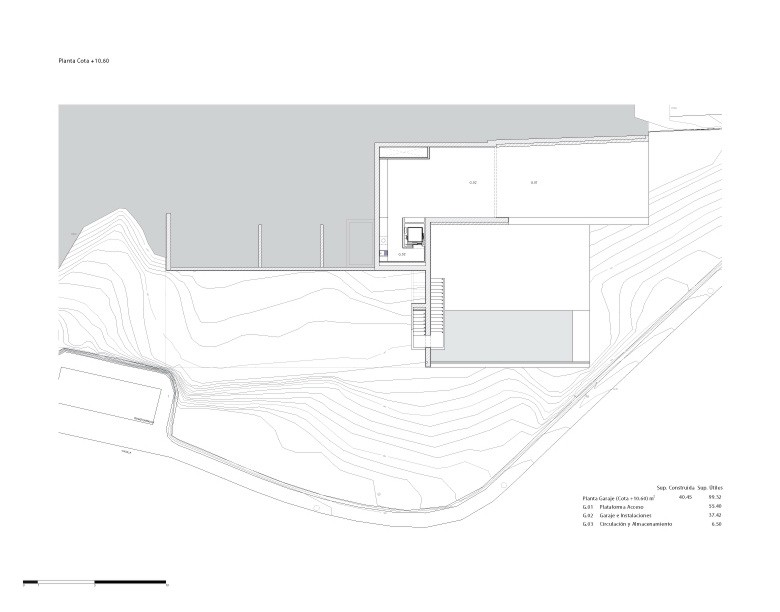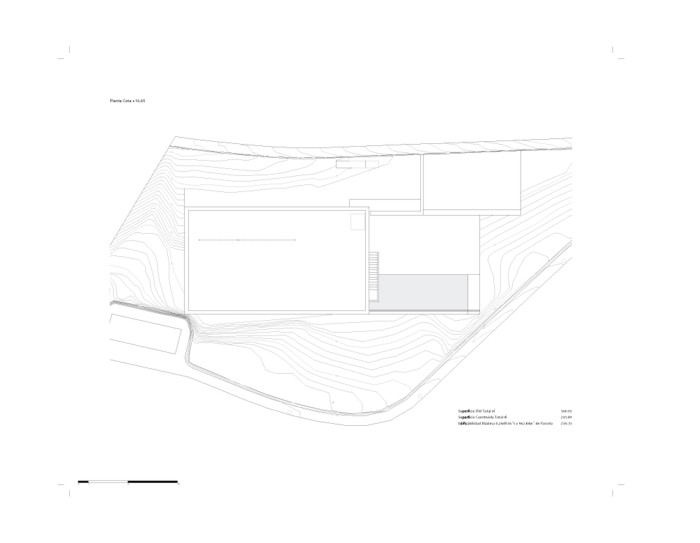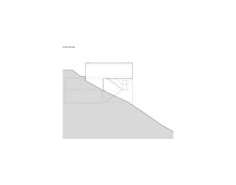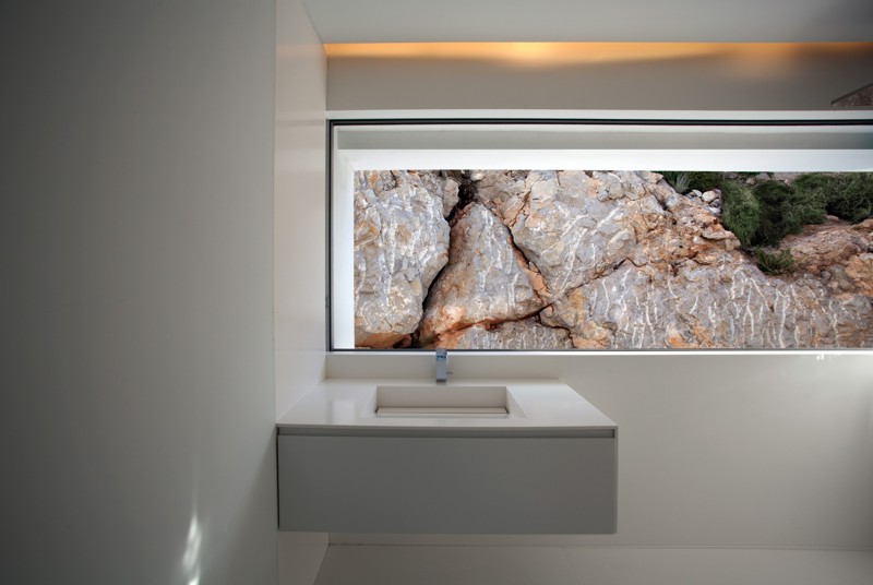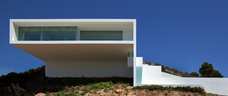 Dada la fuerte pendiente de la parcela y la voluntad de desarrollar la vivienda en una sola planta. Se opta por una estructura tridimensional de pantallas y losas de hormigón armado que se adapta a la topografía realizando el mínimo movimiento de tierras posible. Esta estructura monolítica anclada a la roca genera una plataforma horizontal ,en la cota de acceso desde la calle, en la que se ubica la vivienda. La zona de la piscina se encuentra a una cota inferior en una zona plana existente en el solar. La estructura de hormigón se aísla térmicamente por el exterior, con un estuco de cal liso, flexible y blanco como acabado. El resto de materiales, paredes, pavimentos, grava de la cubierta…mantienen el mismo color enfatizando el carácter unitario.