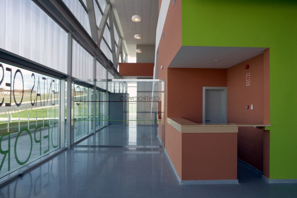 El acceso al centro Cívico se realiza en la cota +0.00m, donde se encuentran el vestíbulo de distribución que contiene los elementos de comunicación vertical (escalera y ascensor) y los aseos. Dicho vestíbulo a doble altura tiene la posibilidad de unirse al del polideportivo en caso de que sea necesario, o bien de independizarse por medio de un elemento móvil de vidrio transparente que constituye una barrera física que favorece la gestión separada de uno y otro programa, pero que no por ello rompe la percepción espacial del conjunto.