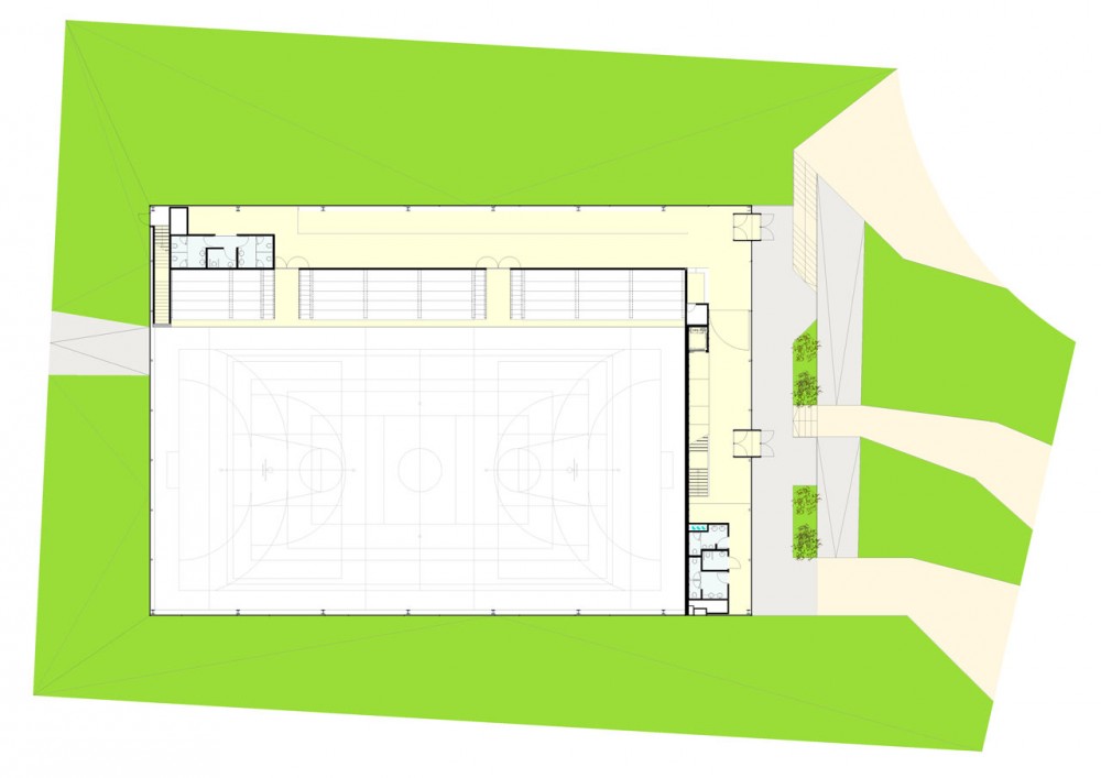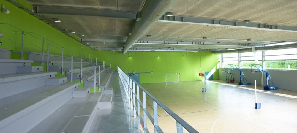 Las zonas que el Polideportivo ocupa en la planta baja se corresponden con el acceso tanto de deportistas como de visitantes; estos últimos acceden a la zona de graderíos en esta cota +0.00, en la cual se sitúan también los aseos y la zona de control, además del vestíbulo que distribuye a los visitantes y contiene la rampa que conduce a los deportistas al nivel de la pista. Dicha rampa discurre paralela a la fachada Oeste, cuyo cerramiento vertical es de policarbonato en el que se inserta un hueco de vidrio transparente que acompaña al movimiento de bajada.
