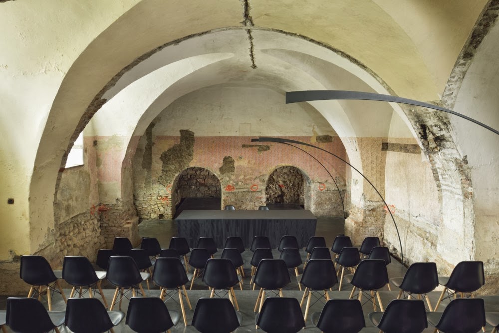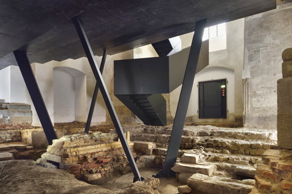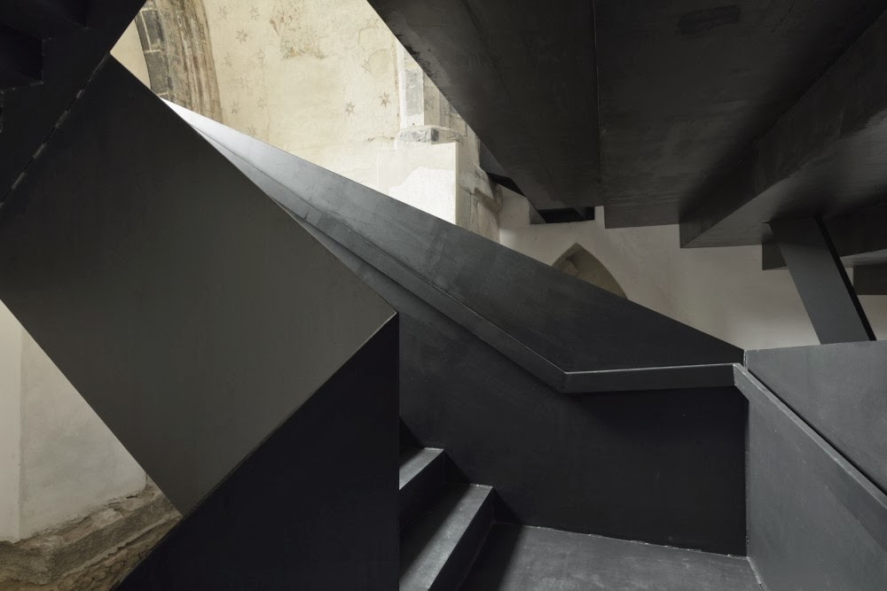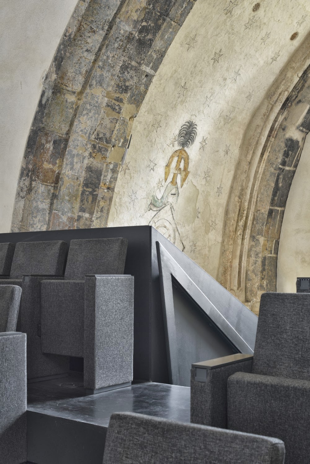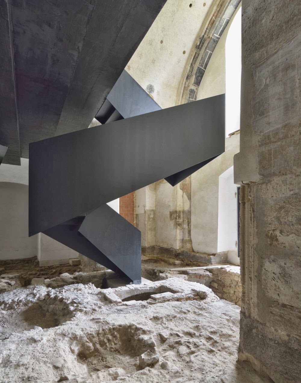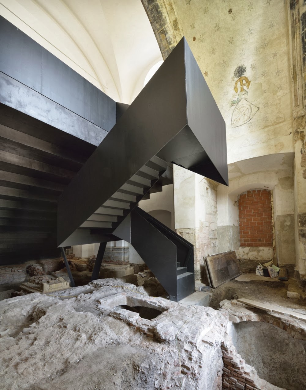 El mismo hecho de que hay que conectar los espacios terminados y los que aún no están terminados, y como si esto fuera poco, de diferentes épocas históricas -, la expresión de esta nueva “alfombra” viene con un poco más de presencia de lo que podría esperarse . Los espacios están unidos entre sí en un diseño más sólido por el hormigón negro de pavimentación, que es suficientemente neutro para no competir con la belleza reavivada de las partes restauradas de la construcción, y sin embargo, genera un contraste suficiente para ahogar el caos de las partes de la edificio que están aún a la espera su finalización. Este concepto espacial de diseño sencillo cuenta con un giro fundamental en el espacio principal de eventos – la nave. Después de que la construcción de los pisos añadidos había sido derribada, tras el trabajo arqueológico se revelaron hallazgos ricos en la sección central de la antigua iglesia gótica. Los sepulcros, retablos, y los restos de las escaleras y suelos hechos con lápidas romanas serán presentados “in situ”. Por encima de esta sección, la nueva planta se elevó en el espacio, formando gradas para los visitantes, y al mismo tiempo que actúa como una partición espacial entre la iglesia barroca reconstruida y los restos del antiguo edificio gótico.