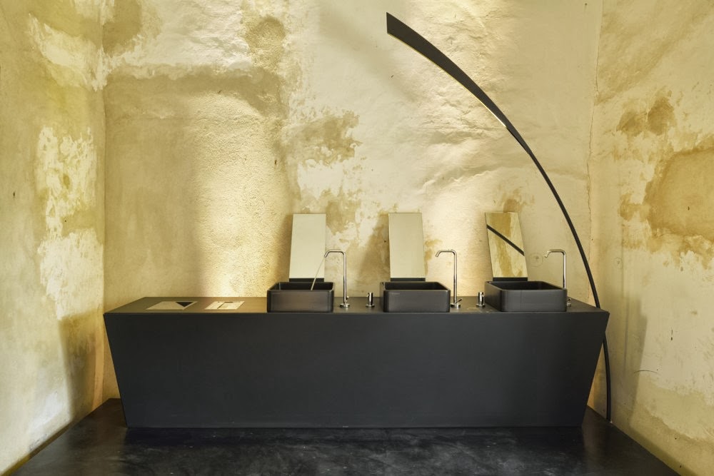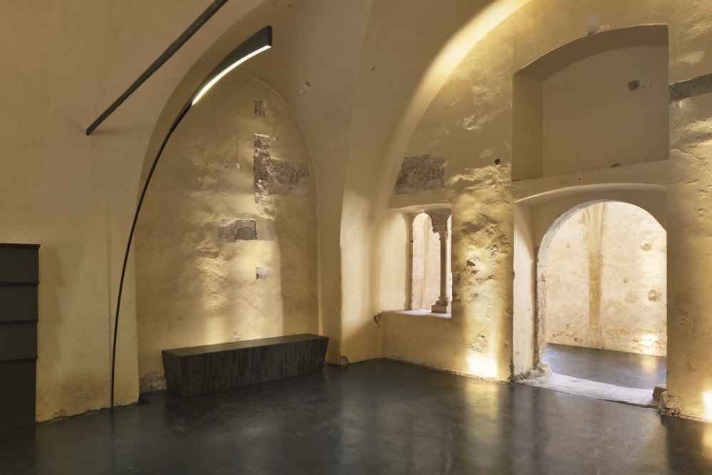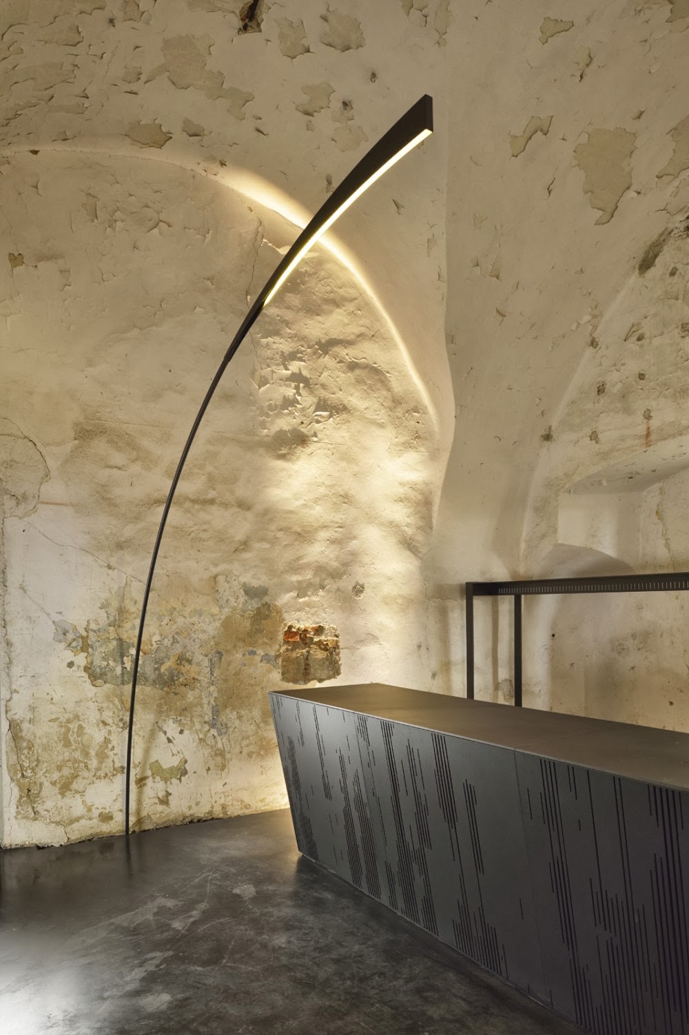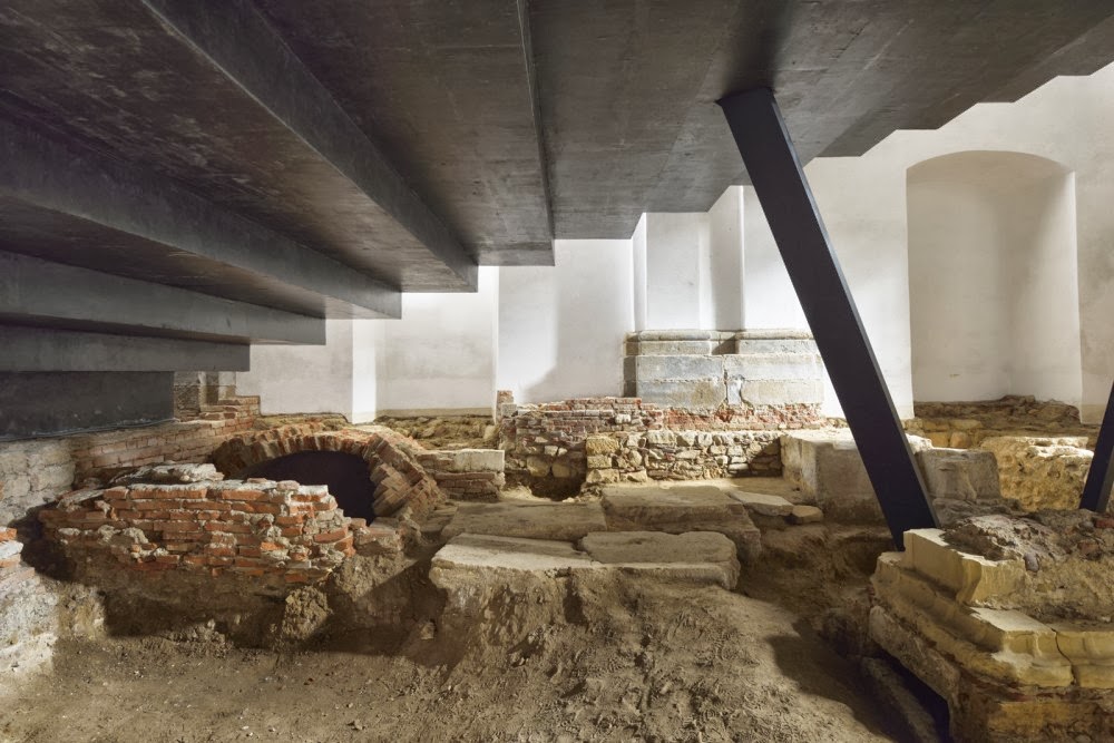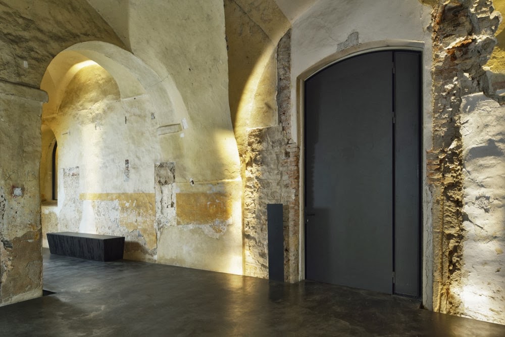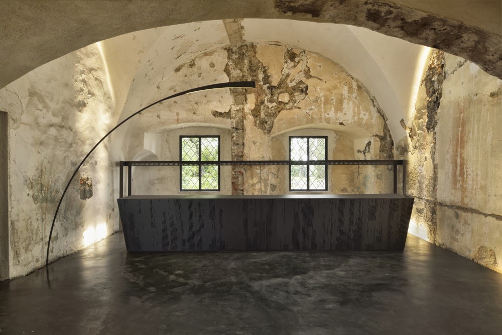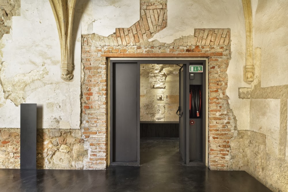 El mismo hecho de que hay que conectar los espacios terminados y los que aún no están terminados, y como si esto fuera poco, de diferentes épocas históricas -, la expresión de esta nueva “alfombra” viene con un poco más de presencia de lo que podría esperarse . Los espacios están unidos entre sí en un diseño más sólido por el hormigón negro de pavimentación, que es suficientemente neutro para no competir con la belleza reavivada de las partes restauradas de la construcción, y sin embargo, genera un contraste suficiente para ahogar el caos de las partes de la edificio que están aún a la espera su finalización. Este concepto espacial de diseño sencillo cuenta con un giro fundamental en el espacio principal de eventos – la nave. Después de que la construcción de los pisos añadidos había sido derribada, tras el trabajo arqueológico se revelaron hallazgos ricos en la sección central de la antigua iglesia gótica. Los sepulcros, retablos, y los restos de las escaleras y suelos hechos con lápidas romanas serán presentados “in situ”. Por encima de esta sección, la nueva planta se elevó en el espacio, formando gradas para los visitantes, y al mismo tiempo que actúa como una partición espacial entre la iglesia barroca reconstruida y los restos del antiguo edificio gótico.