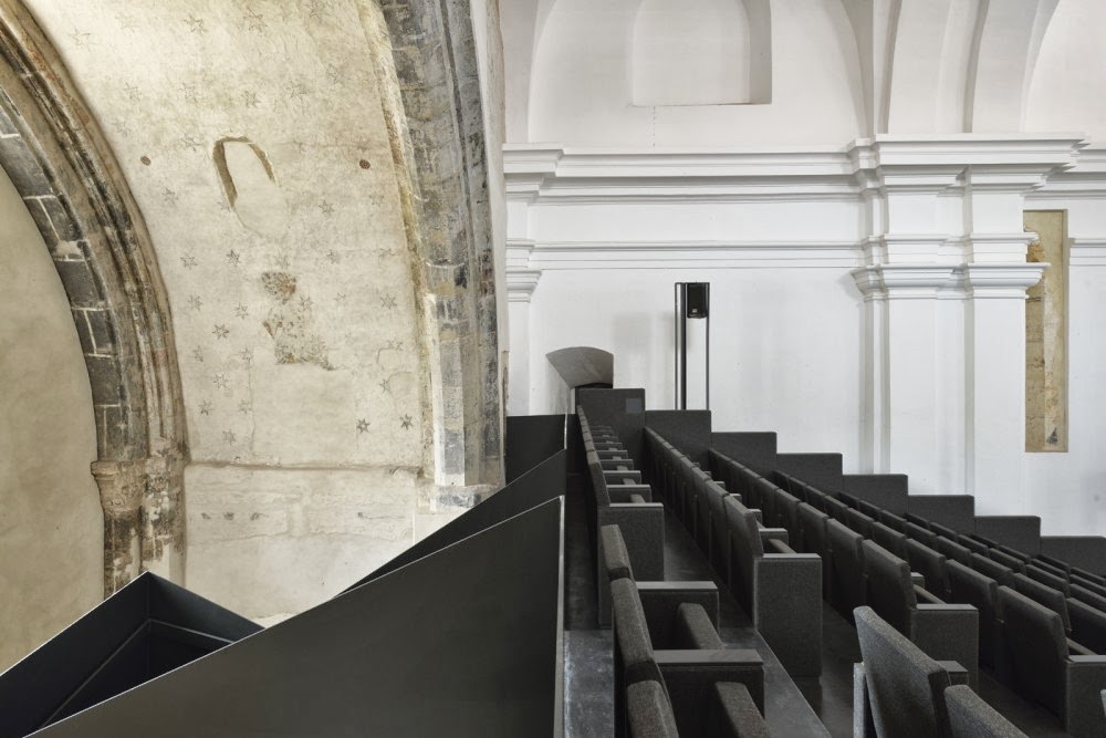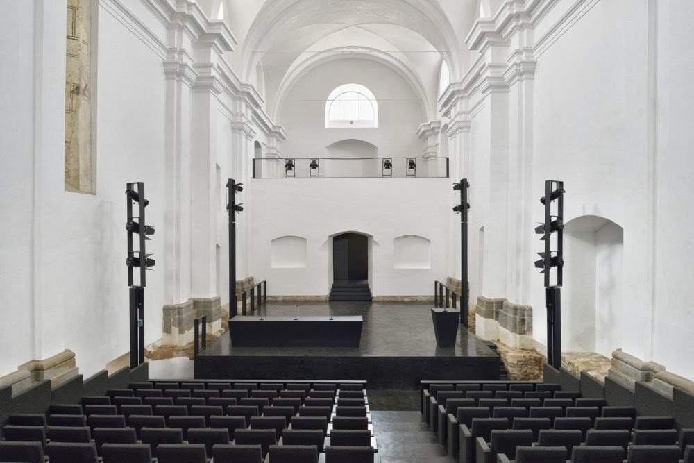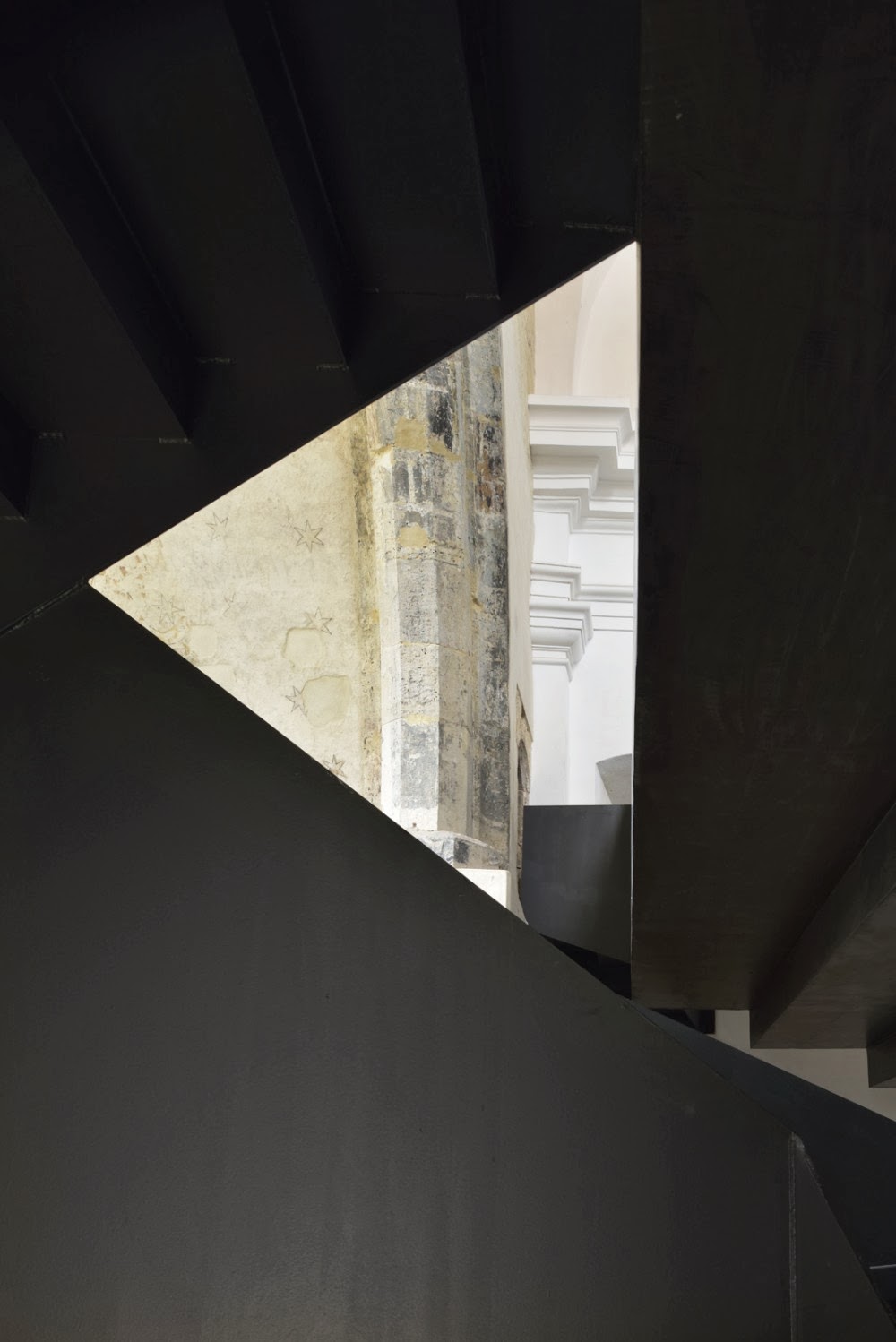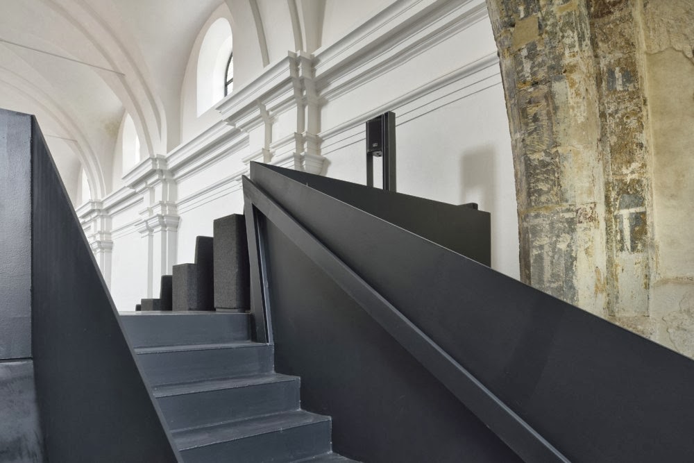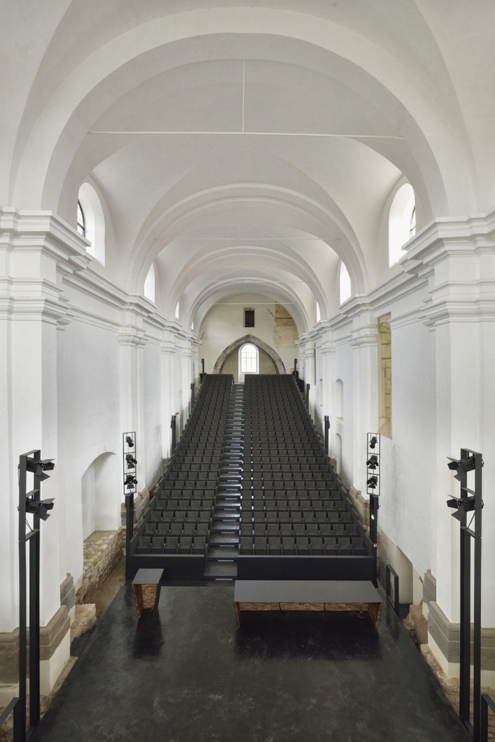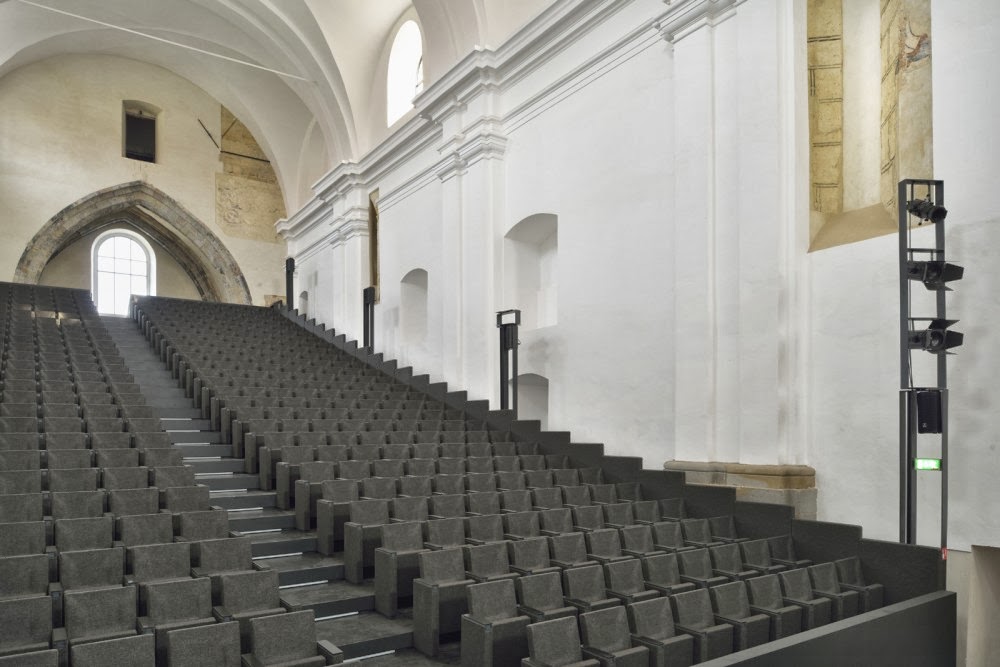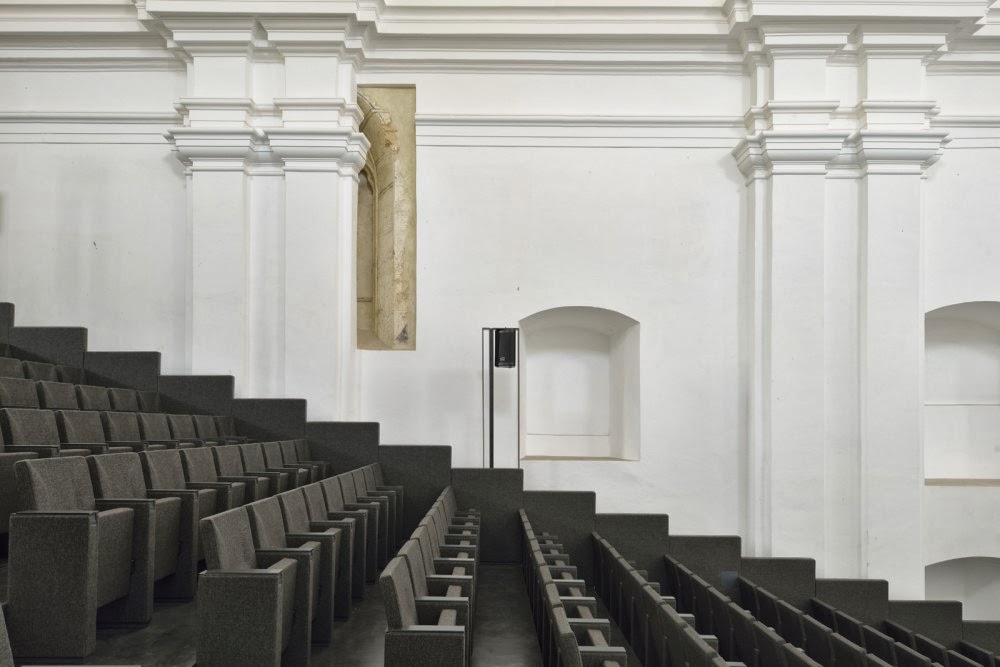 El camino a lo largo de la escalera hacia los asientos de los visitantes es, pues, una secuencia de diferentes experiencias espaciales. Después de haber dado un paseo en medio de los hallazgos arqueológicos, el primer aterrizaje ofrece una vista de la planta del edificio gótico antiguo, en el rellano del segundo, donde se puede echar un vistazo de cerca a los detalles recientemente descubiertos de la arquitectura medieval, mientras que en el extremo, hacia la parte superior, la vista de todo el esplendor de la nave barroca se abre poco a poco. El contraste entre la nueva planta y la sustancia histórica del monasterio antiguo es deliberadamente más grande en el aspecto negro sobre blanco de la sala principal, haciendo referencia al famoso hábito blanco y negro de la Orden Dominicana, donde el blanco es el símbolo de la inocencia y el negro de modestia.