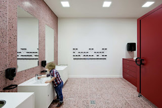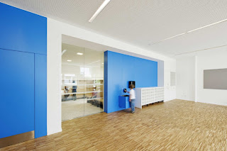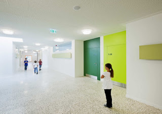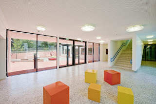 Good orientation and quick ways for children and adults are provided by a simple routing system between the functional areas of the two-floor ensemble. The new main entrance to the school is also the assembly hall and connects the existing school building with the new building. The façade is developed as a ‘pixeled’ white envelope. Format and joining patterns of the “window pixels” meet the current utilisation needs whereby the rooms at the back can be interpreted from outside and the recall value of the individual building sections is enhanced. The façade surfaces alternate between smooth and rough plaster which, particularly in grazing light, creates a vivid impression.