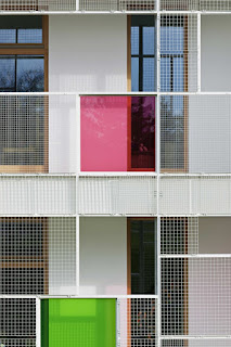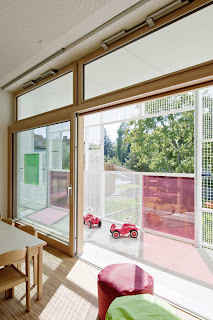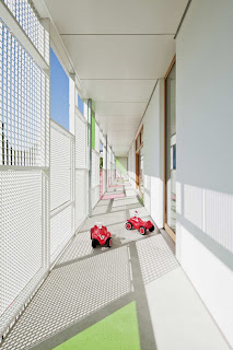 “Pixels” protrude into the corridors and from the façade; they are used by the children as nests to read and to cuddle up in. All activity areas have green and free surfaces. The playground used for breaks turns into a climbing and adventure scenery by its dazzling orange rubber surface, the roof terrace with the smoothly concreted surface becomes a race course. Crèche and kindergarten form a common one to two floor patio which forms a settled pacified centre surrounded by play corridors, multi-purpose and action rooms. The colourful door and ventilation elements of the room-high glass façade allow a for an event room to emerge which can be used flexibly. There is a two-floor loggia of a white-coated welded grid and coloured glass pain curtain to the west of the group rooms on the left, in front of the kindergarten. It complements the monolithic character of the building and is both a sunshade and fall-protection. Depending on the viewing angle, the façade appears anything from transparent to closed, from the interior, however, it embodies a protective second envelop, allowing the smallest children a glance into the greenery and conjures colourful spots of light in the room.