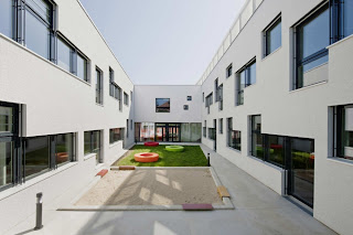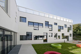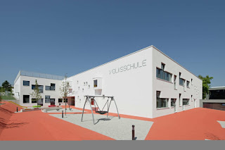 The association of architects MAGK illiz won the competition and was awarded the tender. The draft of the project team MAGK illiz breaks up the construction into L-shaped bodies which are interlaced in such a manner that different places and free spaces to play in and for learning are formed in the interstices.