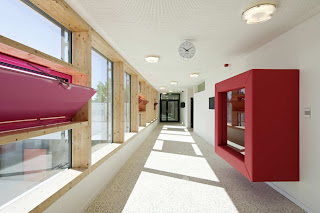 The entire new building complies with passive house standards, the aim of which is greatest ease and comfort for the user at lowest possible operating costs.. With an innovative ventilation concept it is possible to achieve a minimisation of costs with regard to the operating times of the mechanical ventilation. For this purpose the classrooms and group rooms are aired by transverse ventilation via acoustic slot openings across the corridor zones without noise from the corridor being transported into the classrooms. This concept also technically ensures that overheating in summer is prevented temperatures dropping at night. Thanks to efficient cost control the overall budget could also be used to redevelop and renovate the existing gym in the scope of this extension. Furthermore, the circulating strip lights could be renewed and provided with circumferential horizontal, partially movable sun protection louvers.
