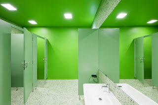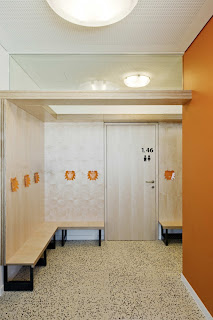 Unlike the high-contrast façade, the design of the interior rooms is characterised by varying, finely tuned colour and material combinations. The differing design of doors, cloakrooms and wall panels in an individual range of colour for each area of activity facilitates finding the way and increases their identification, particularly for the children. The cloakrooms of the children’s groups are covered in wood and meander like snails shells into private niches.