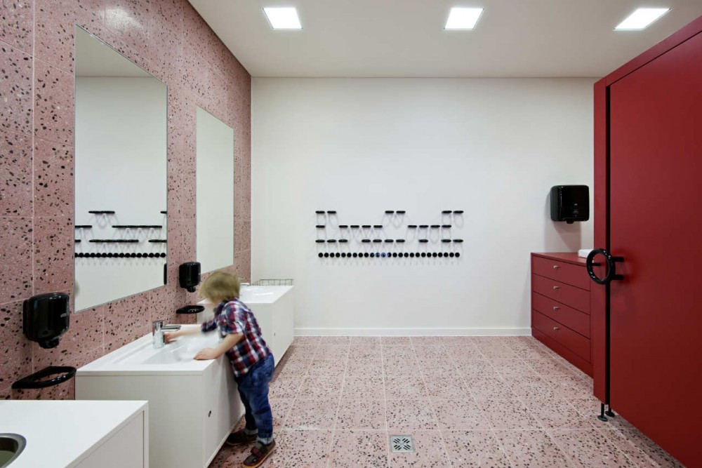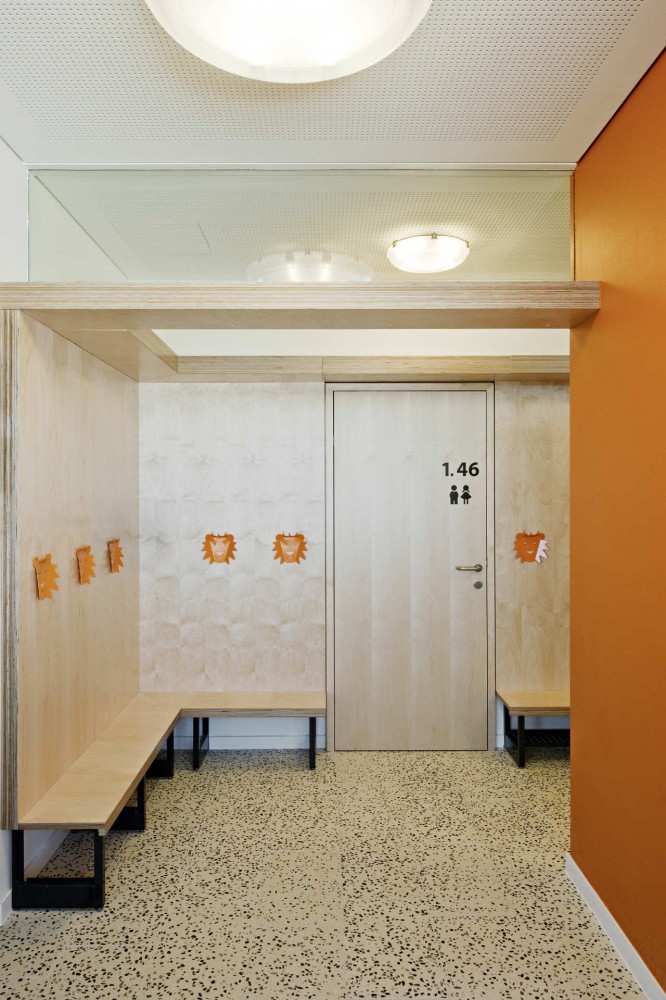Unlike the high-contrast façade, the design of the interior rooms is characterised by varying, finely tuned colour and material combinations. The differing design of doors, cloakrooms and wall panels in an individual range of colour for each area of activity facilitates finding the way and increases their identification, particularly for the children. The cloakrooms of the children’s groups are covered in wood and meander like snails shells into private niches.