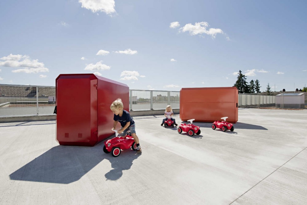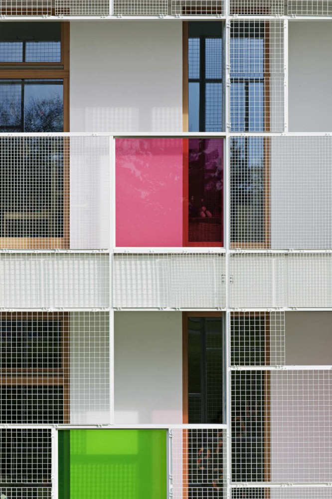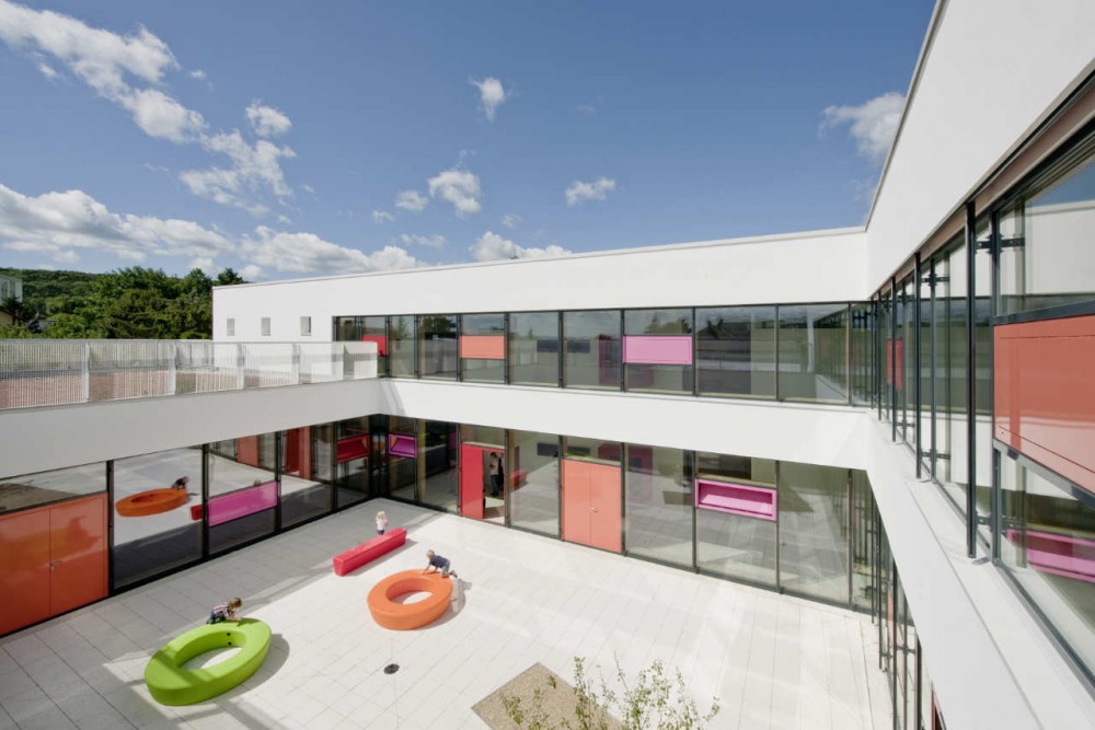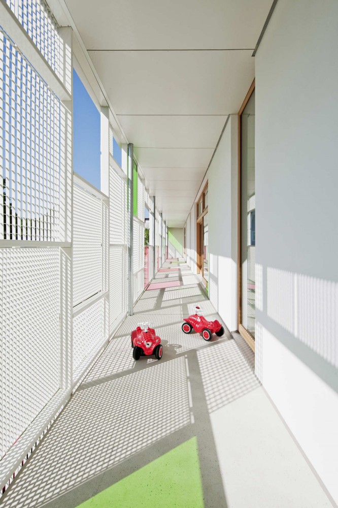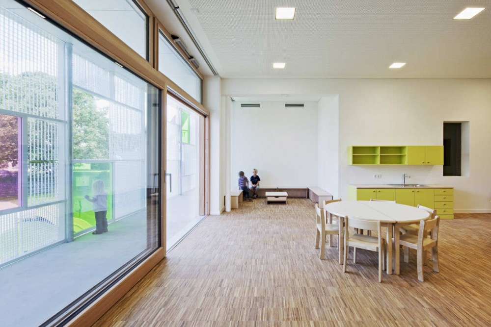 “Pixels” protrude into the corridors and from the façade; they are used by the children as nests to read and to cuddle up in. All activity areas have green and free surfaces. The playground used for breaks turns into a climbing and adventure scenery by its dazzling orange rubber surface, the roof terrace with the smoothly concreted surface becomes a race course. Crèche and kindergarten form a common one to two floor patio which forms a settled pacified centre surrounded by play corridors, multi-purpose and action rooms. The colourful door and ventilation elements of the room-high glass façade allow a for an event room to emerge which can be used flexibly. There is a two-floor loggia of a white-coated welded grid and coloured glass pain curtain to the west of the group rooms on the left, in front of the kindergarten. It complements the monolithic character of the building and is both a sunshade and fall-protection. Depending on the viewing angle, the façade appears anything from transparent to closed, from the interior, however, it embodies a protective second envelop, allowing the smallest children a glance into the greenery and conjures colourful spots of light in the room.