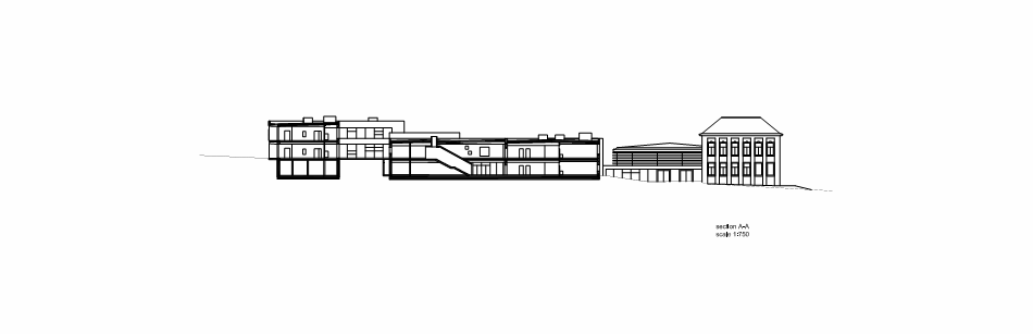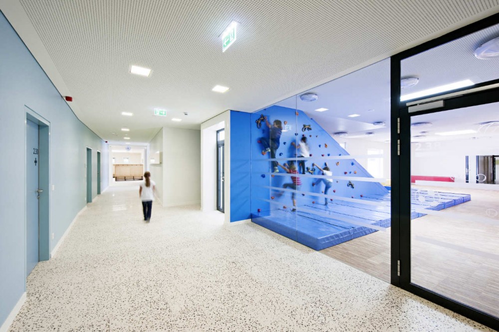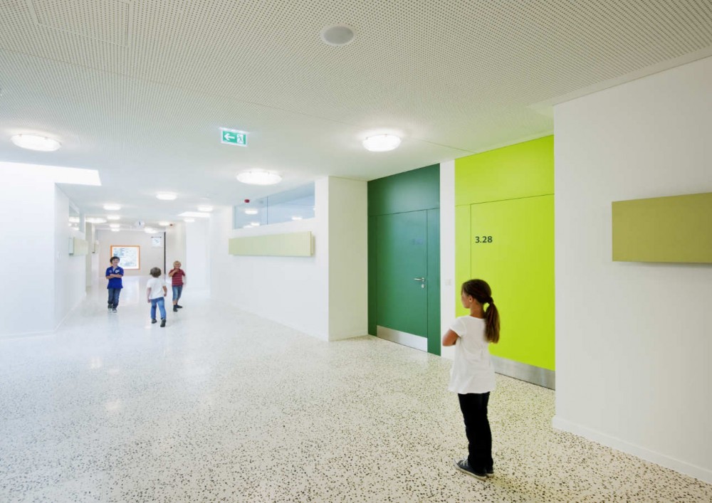 The entire new building complies with passive house standards, the aim of which is greatest ease and comfort for the user at lowest possible operating costs.. With an innovative ventilation concept it is possible to achieve a minimisation of costs with regard to the operating times of the mechanical ventilation. For this purpose the classrooms and group rooms are aired by transverse ventilation via acoustic slot openings across the corridor zones without noise from the corridor being transported into the classrooms. This concept also technically ensures that overheating in summer is prevented temperatures dropping at night. Thanks to efficient cost control the overall budget could also be used to redevelop and renovate the existing gym in the scope of this extension. Furthermore, the circulating strip lights could be renewed and provided with circumferential horizontal, partially movable sun protection louvers.