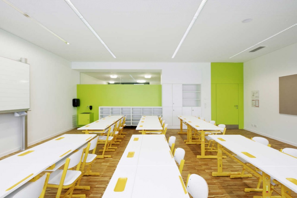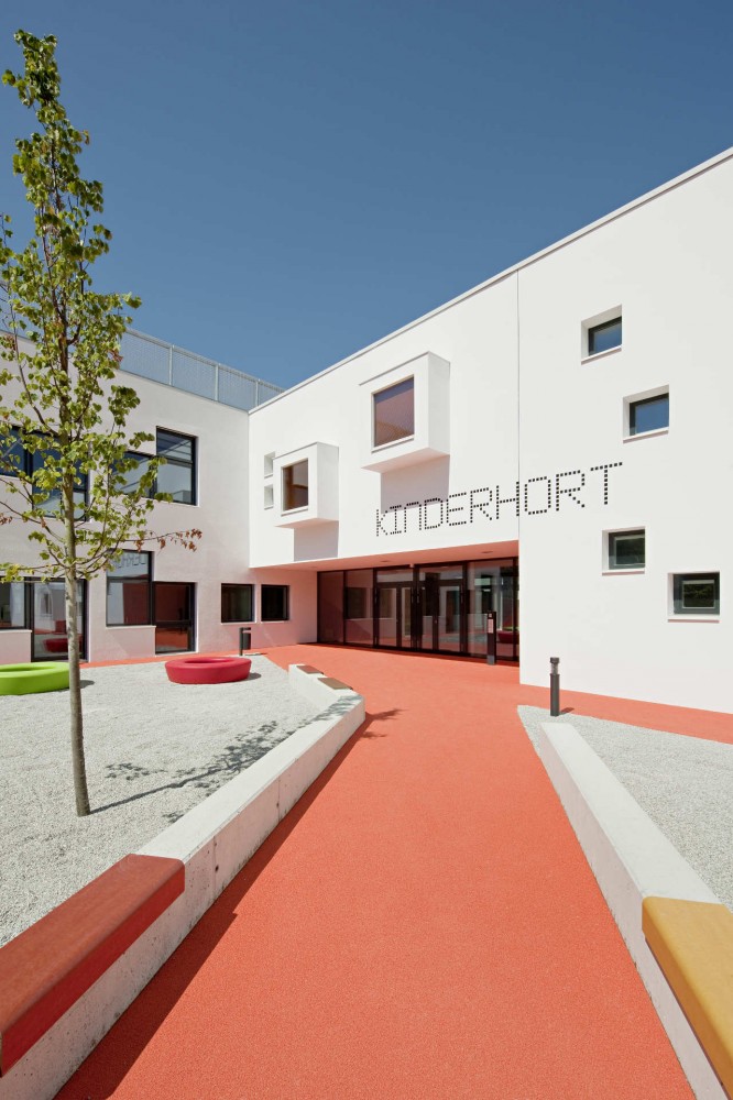 Good orientation and quick ways for children and adults are provided by a simple routing system between the functional areas of the two-floor ensemble. The new main entrance to the school is also the assembly hall and connects the existing school building with the new building. The façade is developed as a ‘pixeled’ white envelope. Format and joining patterns of the “window pixels” meet the current utilisation needs whereby the rooms at the back can be interpreted from outside and the recall value of the individual building sections is enhanced. The façade surfaces alternate between smooth and rough plaster which, particularly in grazing light, creates a vivid impression.