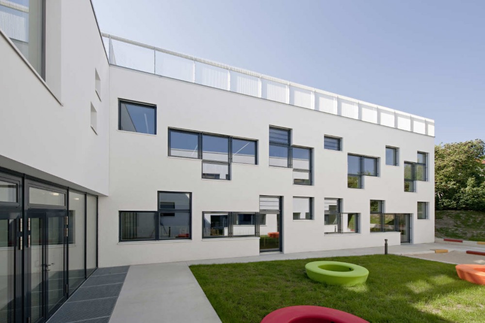 An influx and increasing birth rate in the community situated to the south of Vienna called for the creation of more, particularly state-of-the-art child care facilities. Therefore a competition tender submission for a new child care centre was issued in 2008. The existing 19th century ‘Gründerzeit’ school was to be extended by eight primary school classes, a after-school care club and a kindergarten with kitchen.