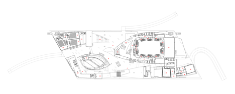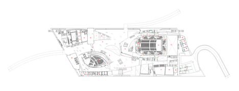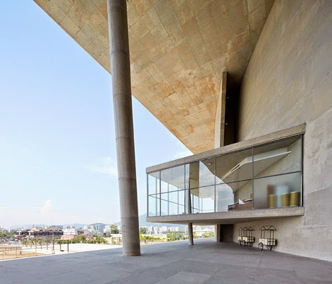 Between the two horizontal plates of the roof and the terrace are set the large curved concrete walls that contain the halls in an interplay of volumes and voids.