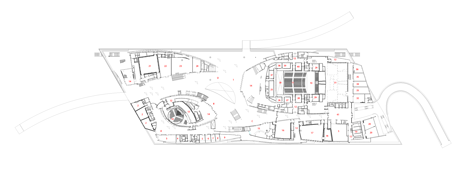 Two large horizontal slabs of concrete form the primary floor level and roof of the complex. These are interspersed with a variety of elevated boxes, large curving fins and splayed columns that frame the various internal activities.