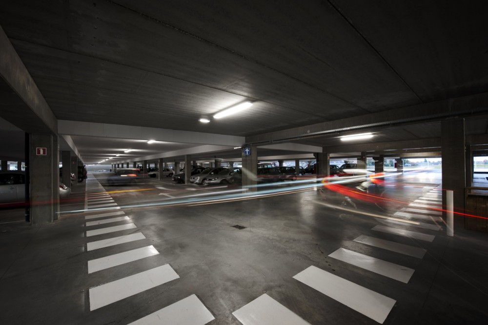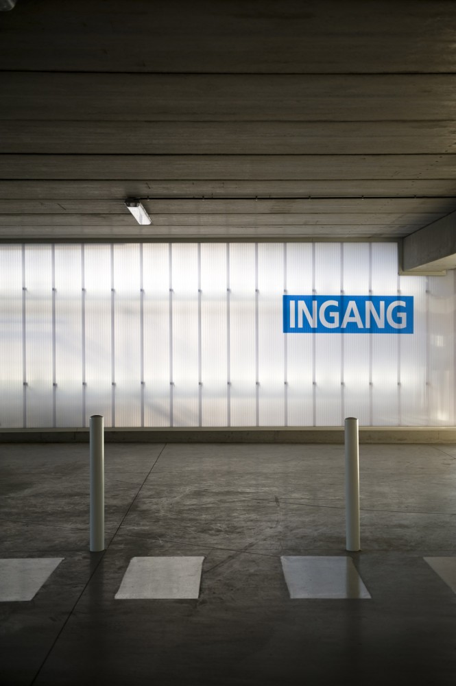 We interpret the building as a concrete table on which a bright white shop volume has been placed. The shop is lifted above the ground, with the parking area extending under the building. That results in major optimisation of the use of the available ground.