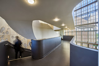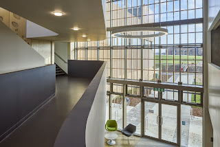El edificio oeste revestido en cedro rojo alberga un patio con orientación sur que mira hacia el campus original de UEA y NNUH y proporciona un enfoque seguro y da sentido de lugar a los ocupantes del edificio, mientras que el sitio del NRP se desarrolla alrededor de ellos. La entrada principal se caracteriza por un atrio generosamente iluminado, animado por un café compartido del edificio en la planta baja y la escalera que une las dos alas del edificio anterior. Son estos dos espacios comunes los que fomenten la colaboración alentando a todas las áreas disciplinares y visitantes del edificio a reunirse.
