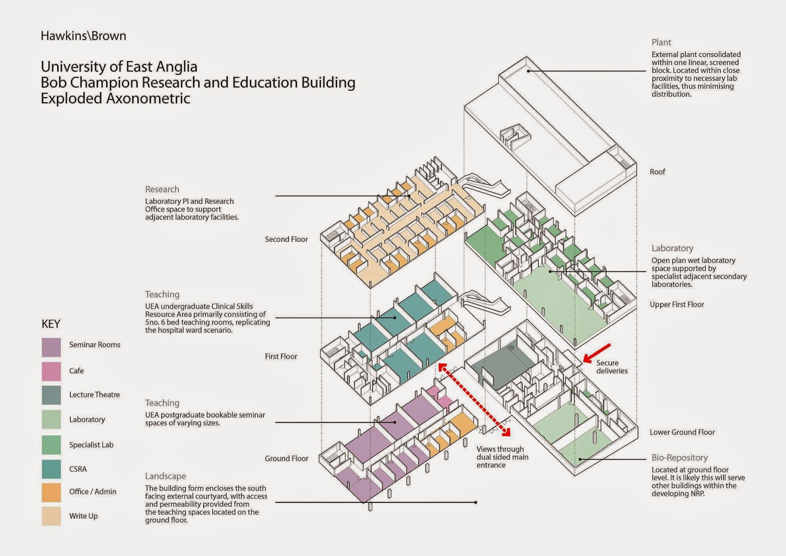 El nuevo laboratorio y las instalaciones de enseñanza clínica de la Universidad de East Anglia, en colaboración con el NHS es el primer edificio ubicado en el Norwich Research Park y adyacente al Hospital Universitario de Norfolk y Norwich. Las instalaciones de investigación del edificio están destinadas a mejorar la atención al paciente, mientras que las áreas de enseñanza clínica se centran en proporcionar entornos de aprendizaje sanitarios auténticos para la Escuela de Medicina de la Universidad. El diseño del edificio cumple igualmente las necesidades de ambas instituciones, creando un edificio de investigación verdaderamente colaborativo y con la mente hacia el futuro.