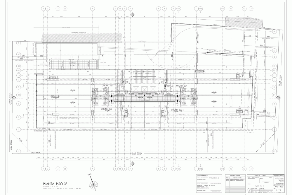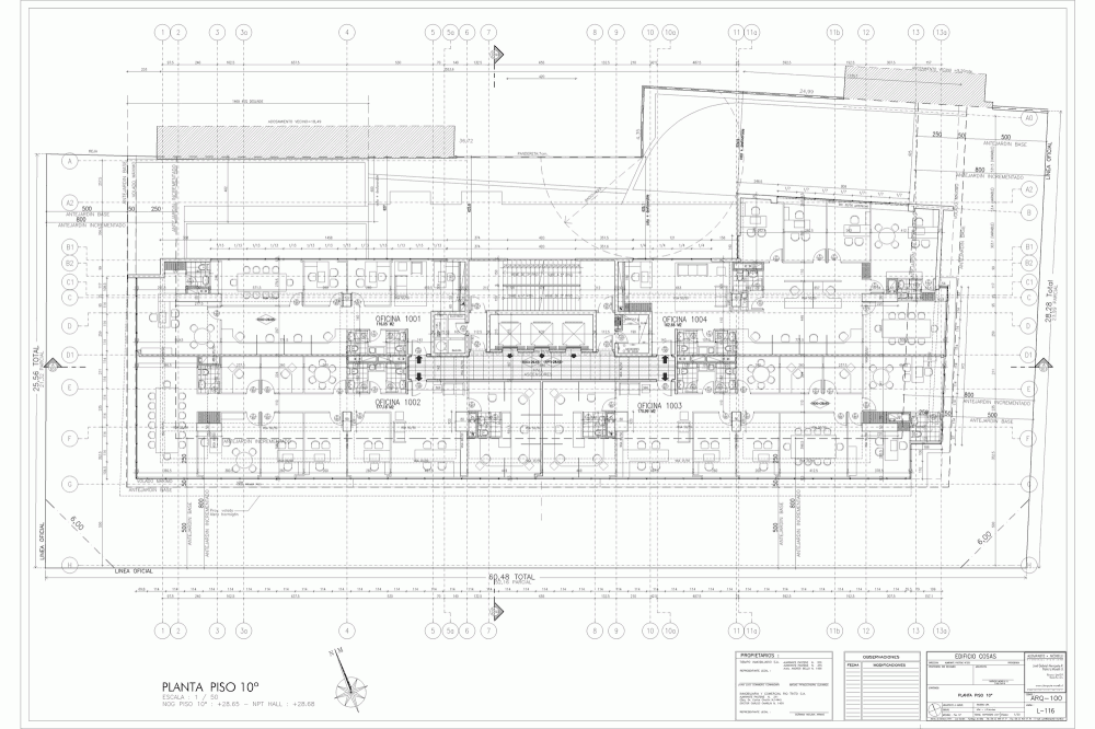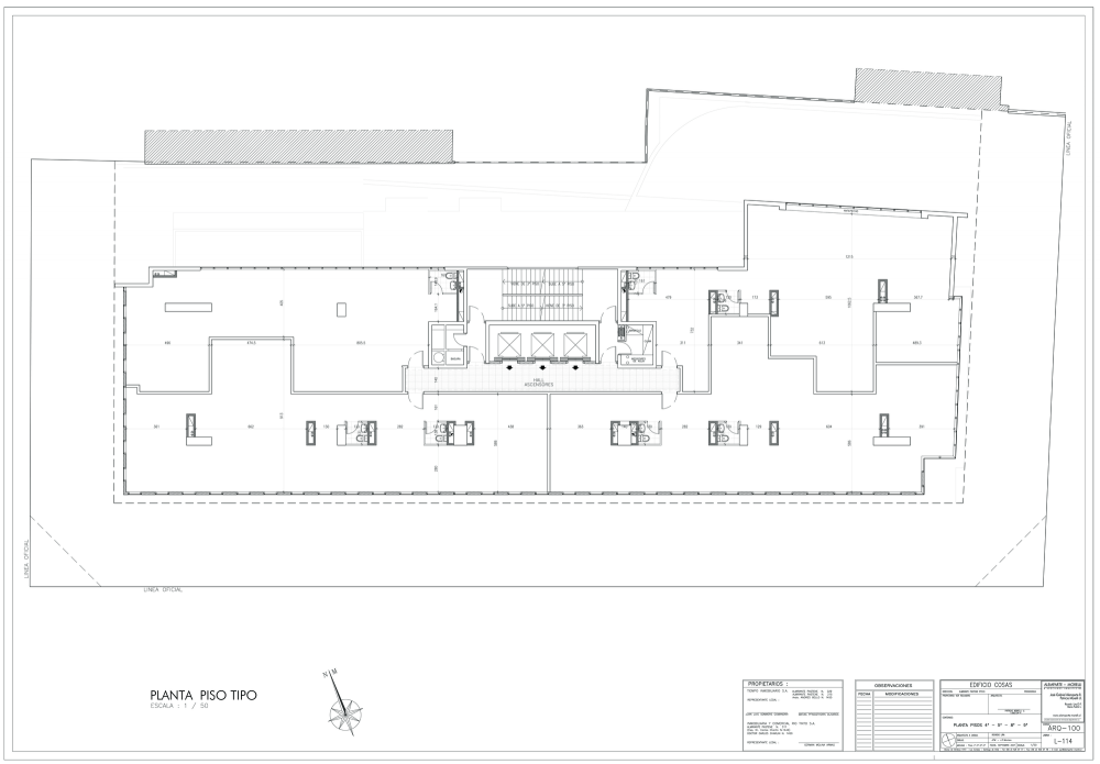 Los 9 niveles sobre la placa se constituyen como plantas libres susceptibles de ser atomizadas en oficinas de tamaño medio (5 oficinas de 150 m2) servidos por un núcleo de ascensores y escalera de seguridad, sus respectivas instalaciones, que se emplaza contiguo a la fachada nor-oriente.