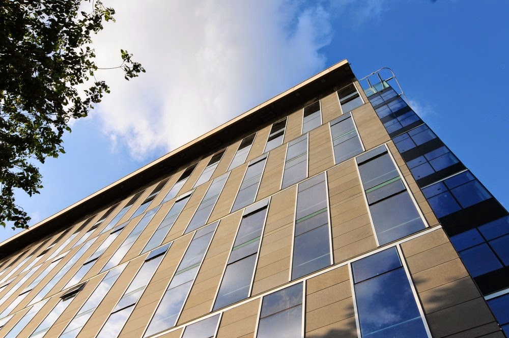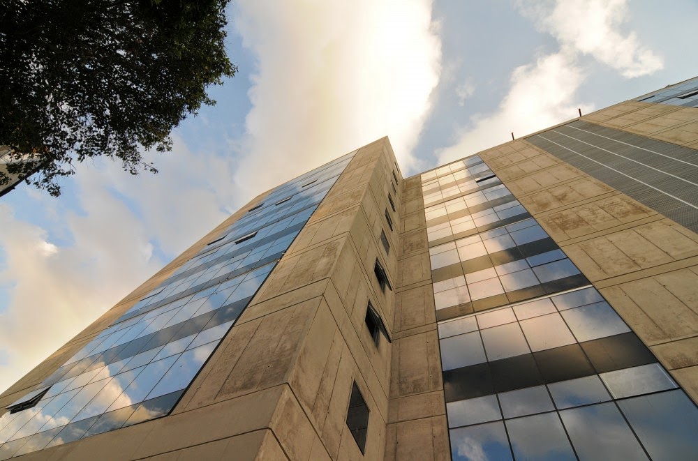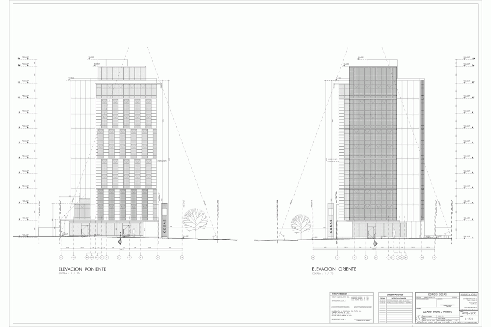 El tratamiento del envolvente y su patteon muro cortina intenta diluir la identificación del piso a piso, produciendo módulos verticales cada dos niveles; un desfase en la verticalidad de los módulos intenta producir un vibrato en el contraste opacidad/transparencia logrando una unidad de lectura en la pieza arquitectónica como elemento que se constituye por adición a la ciudad en el modelo de torre aislada y Ciudad jardín.