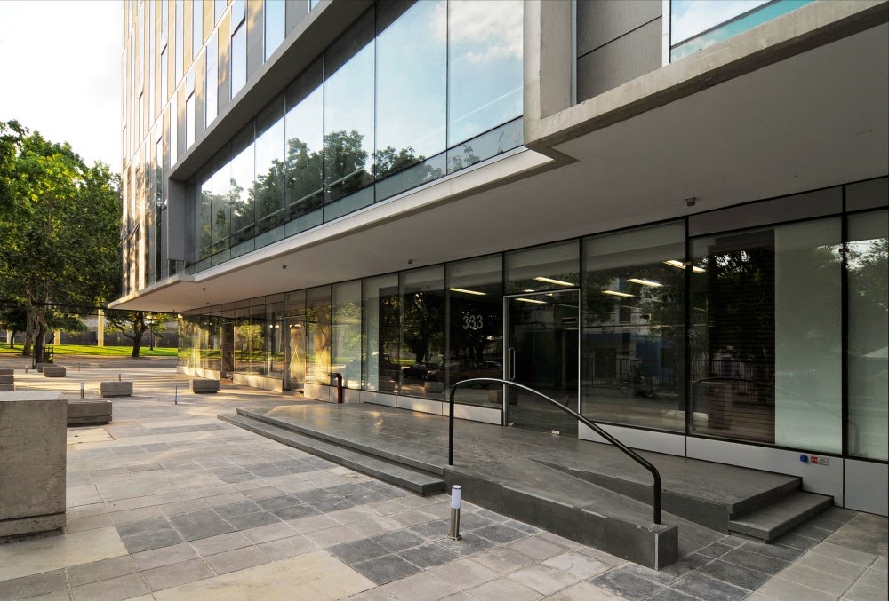 El edificio se emplaza en un solar que da a tres calles, su frente mas relevante hacia la avenida Andrés Bello (parque) y su frente de mayor dimensión (Almirante Pastene) le importan una preponderante orientación hacia el nor-poniente, consecuentemente el edificio en su primer nivel se recoge de la linea de edificación permitida vaciando parte de su placa en beneficio de dotar a la cuidad de un espacio público relevante en todo su frente, constituyendo una amplitud espacial en los perfiles de calles menores como Almirante Pastene, la placa se trabaja como un nivel muy pristino y transparente permitiendo que el comercio se establezca en una relación de continuidad interior-exterior que valoriza el espacio público.