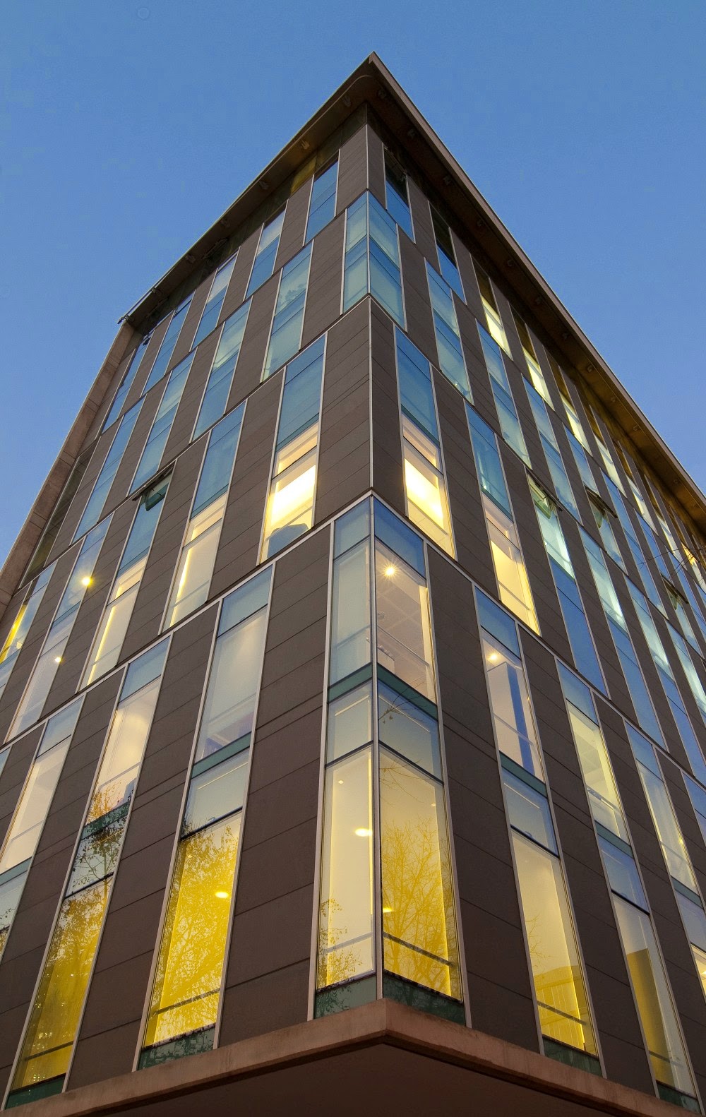 El envolvente del edificio ha sido concebido desde la perspectiva de la eficiencia en el uso de la energía y ambientalmente responsable respecto a su impacto en la cuidad, para ésto se ha desarrollado en las fachadas Norte y Poniente una retícula de muro cortina con un 50% de opacidad por medio de revestimientos ventilados de granito gris y cristales de altas prestaciones en sus valores de coeficiente de sombra y el valor “U” y baja reflectividad para lograr un buen aprovechamiento de la luz natural, lo anterior sumado a un sistema de clima en base al sistema VRV (volumen en refrigerante variable) que optimiza por medio condensadores eléctricos, refrigerantes y flujo variable la operación del clima pudiendo discrecionar por orientación la entrada en funcionamiento de los distintos condensadores.